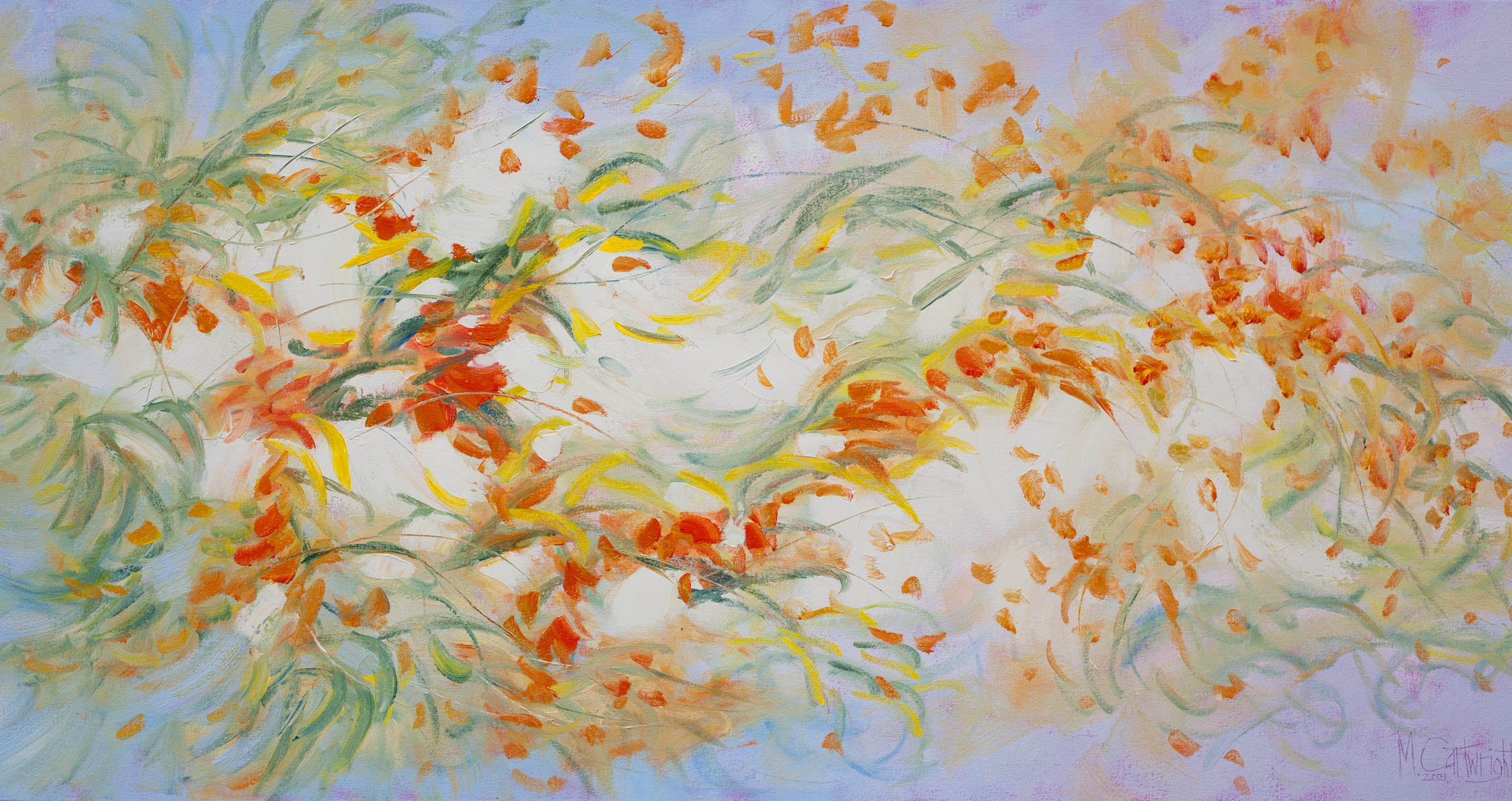 A textured oil painting, spontaneously rendered in a semi abstract style, using a combination of brush and palette knife. My intention was to emphasize the bright colors of the flowers but also create a sense of pattern and rhythm in in the design structure.