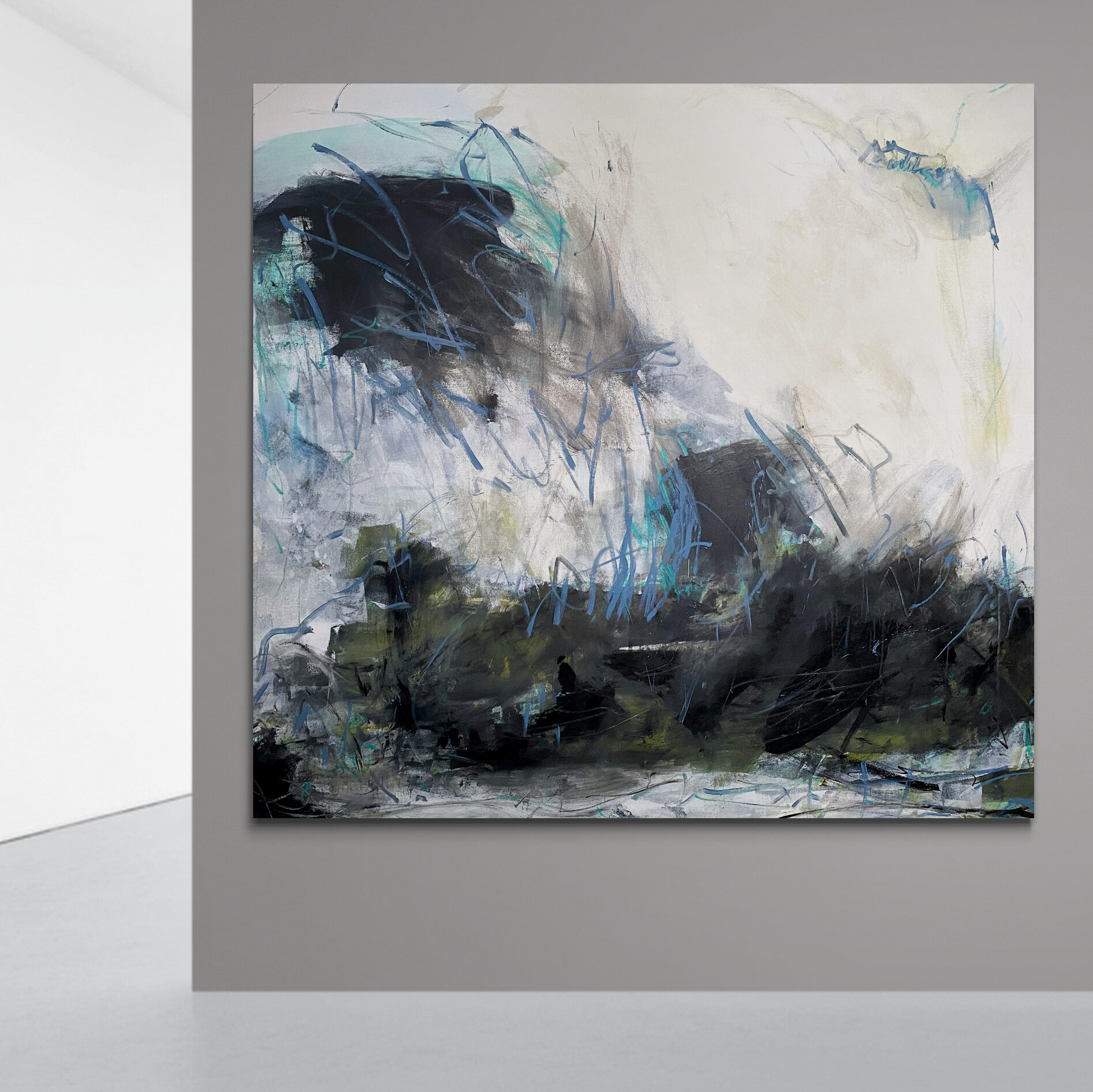 This captivating heartfelt artwork is made all the more intriguing by the bold and intuitive mark-making and striking palette combination of light blue and green hues set against bold marks in black, white and grey tones. It really is a fantastic statement piece filled with emotion.