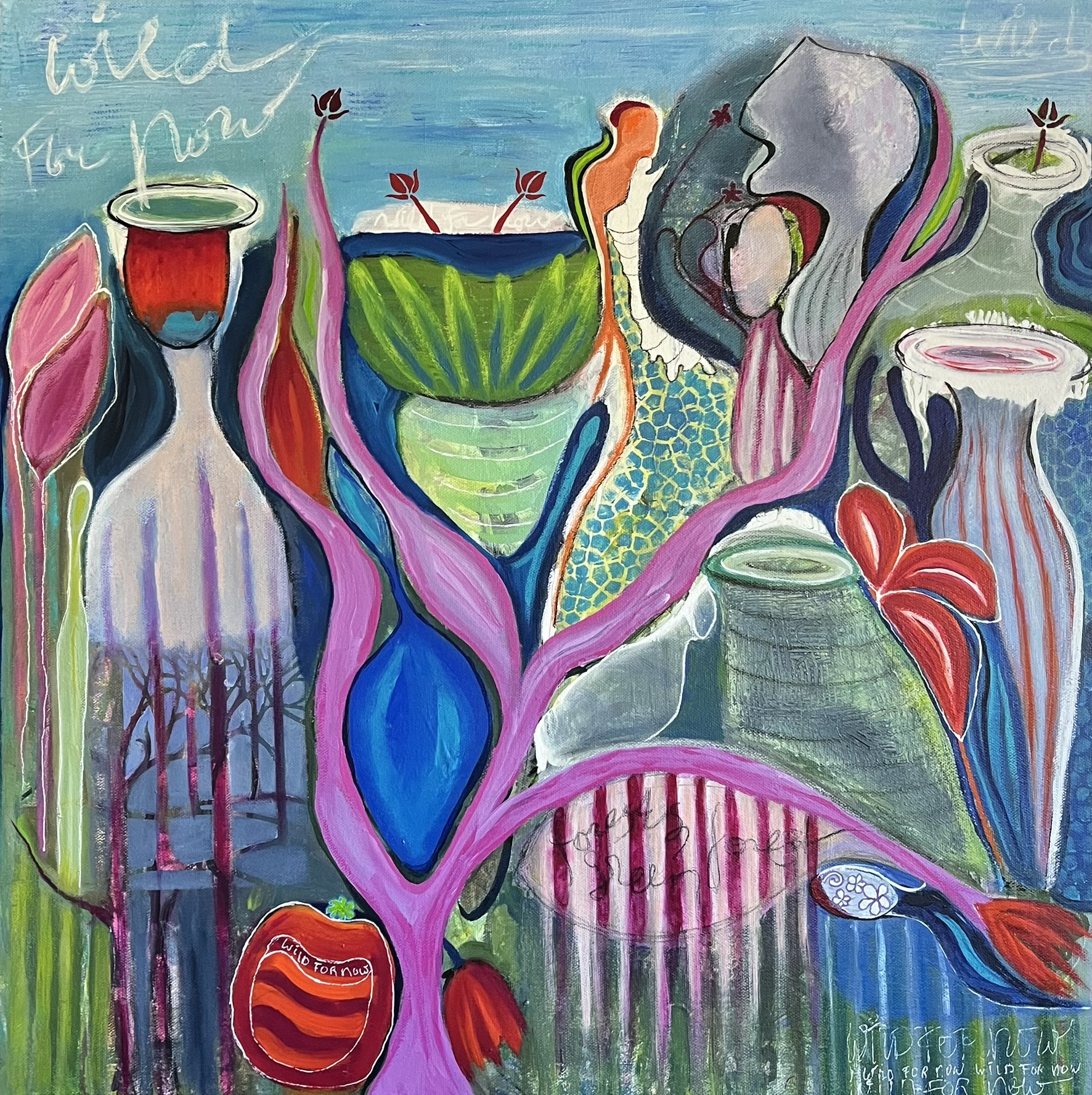 This original painting titled ‘Wild for now’ by Marijke Lambregtse is consumed by the thought of how much ‘wild’ there is left in this world. What does wild mean these days? ‘Wild, living or growing in the natural environment; not domesticated or cultivated, uninhabited. Our very existence is inextricably intertwined with the natural world. … Our physical bodies are built up from the elements and according to the laws of nature’. So how much of this wild thing is left in and around us? This painting is consumed by these thoughts and the artist hopes the viewer will wonder and ponder with her besides giving a wonderful splash of color on the collectors wall
