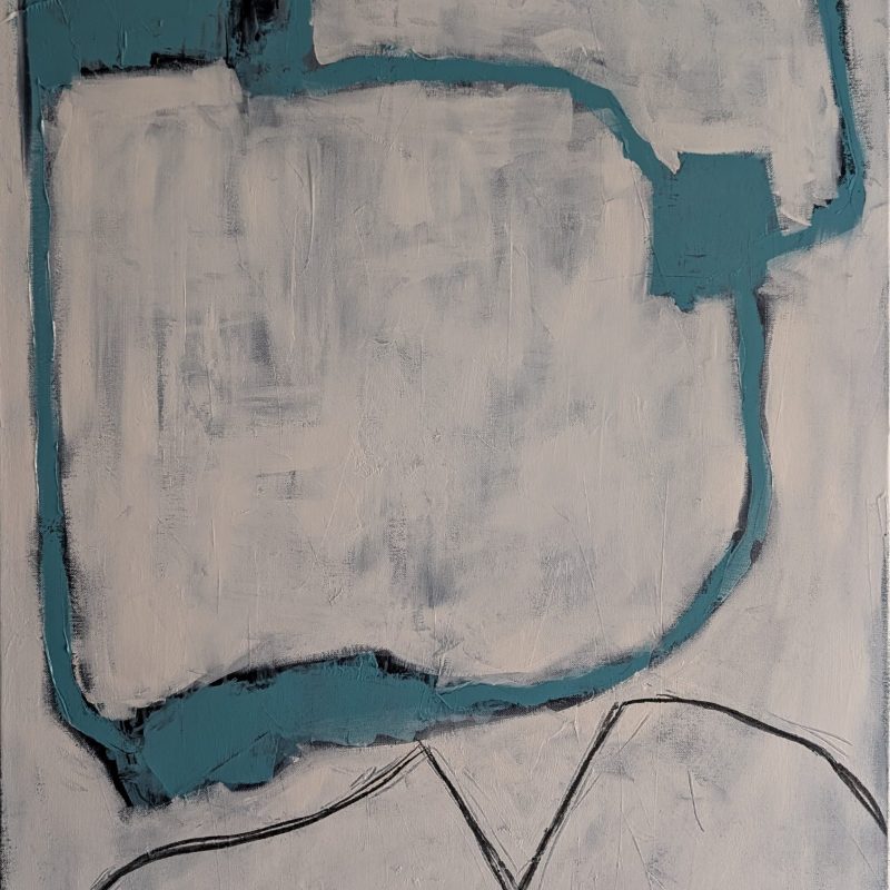 It’s intriguing mark making combined with its restful and calm palette of white, beige and beautiful light and dark blues, pale green and teal mixed with apricot orange and neutral tones along with subtle grey line work.
