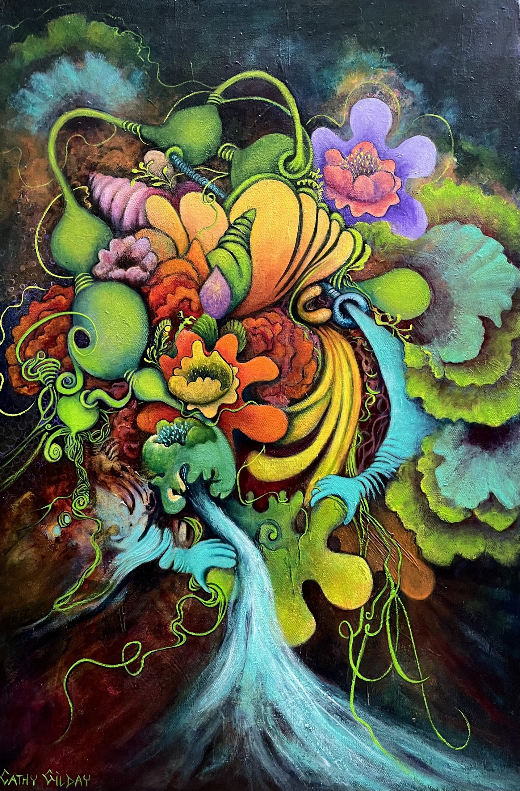 In this abstract botanical painting, I am taking a wild journey of escapism through fantasy and curiosity. I enjoyed working with charcoal and both opaque paint and coloured glazes, allowing the composition to change and evolve, without a definite outcome in mind. In my thoughts, it’s a metaphor for holding on to one’s youth but also allowing for growth. The beauty of this type of painting, is that it allows the viewer to make their own interpretation.