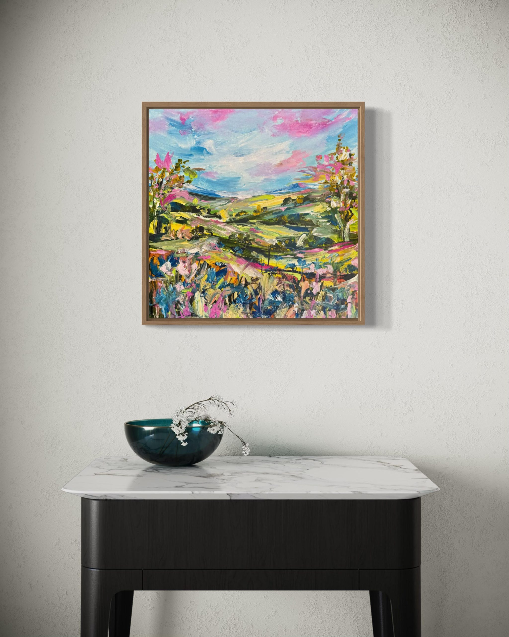 The abstract acrylic painting features a vibrant, chaotic landscape. Rolling hills undulate in bold, overlapping strokes of green, blue, and ochre, creating a sense of movement. In the distance, gum trees are suggested through erratic, vertical dashes of gray and green, their forms blending into the horizon. In the foreground, wildflowers burst forth in a riot of colors—pinks, purples, and yellows—applied with thick, textured brushstrokes. The painting’s overall effect is dynamic and energetic, with the colors and shapes swirling together to evoke a lively, untamed natural scene.