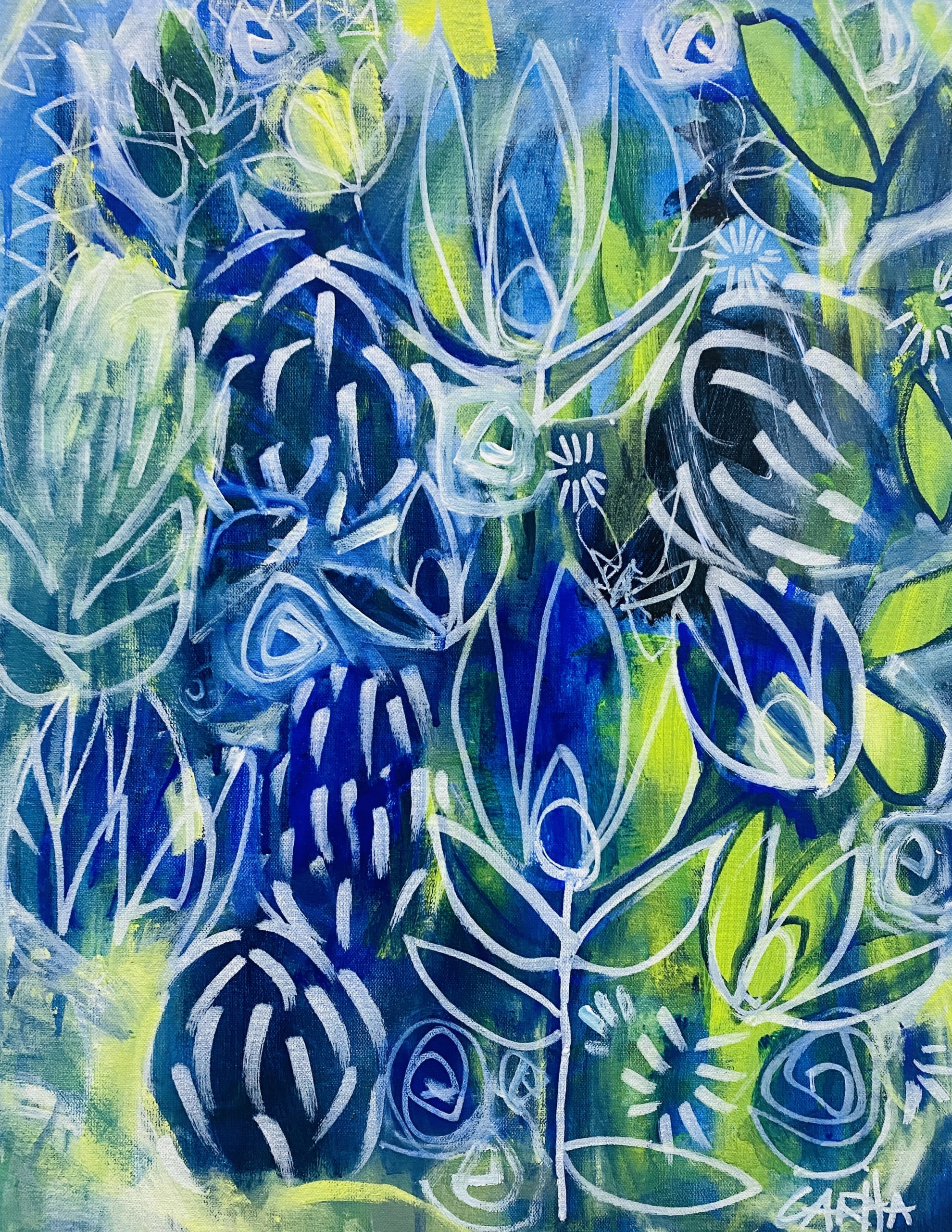 Carita’s series of “boho botanical small studies” are small, playful and expressive artworks created through a highly intuitive process. Each piece explores Carita’s ongoing theme of finding an OASIS where connection to Mother Nature brings connection and discovery of true self and the beauty that lies within.