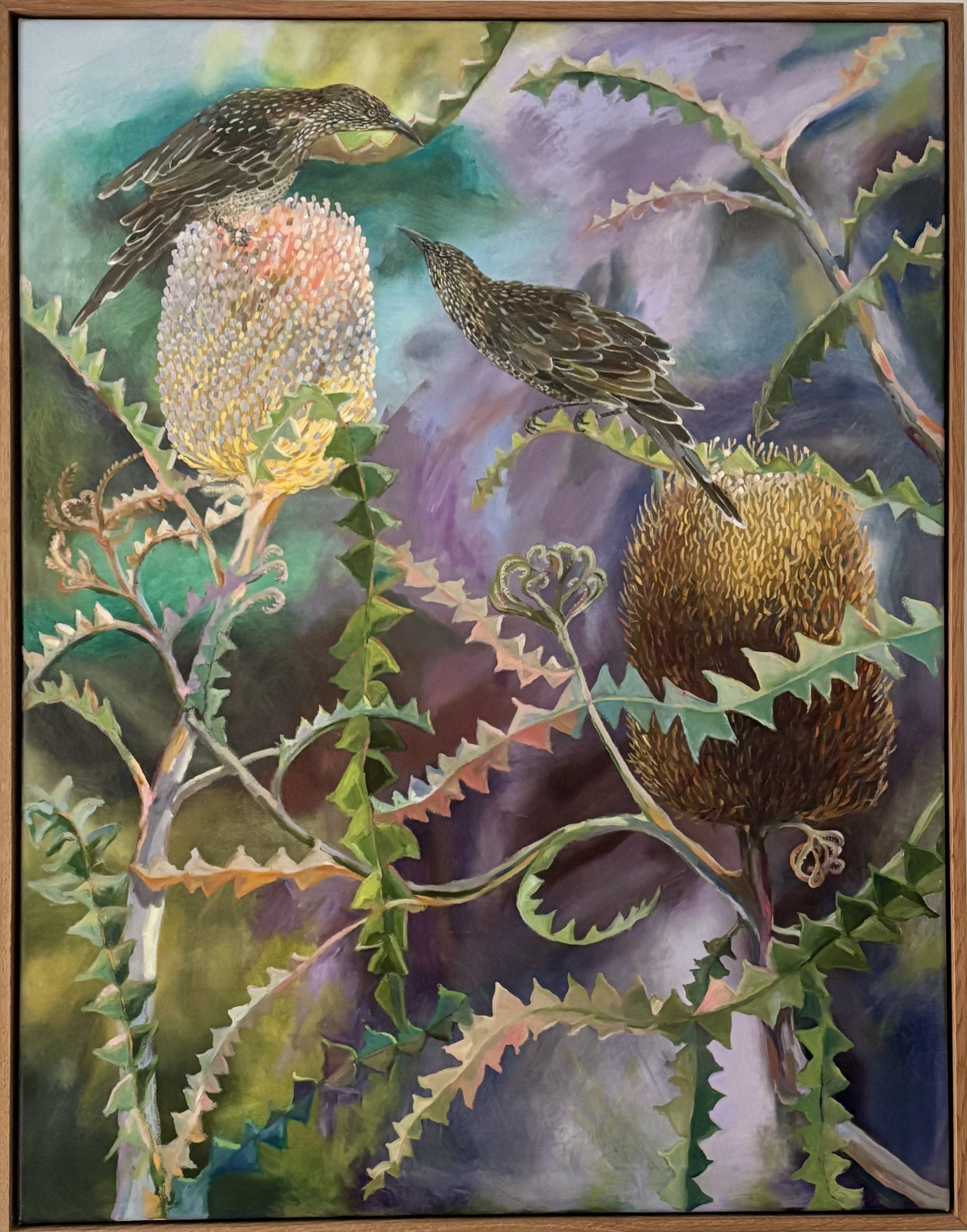 This painting paints a snapshot of these beautiful birds in their favourite habitat. Â I have deliberately tried to capture the intricate tangle of leaves and the subtle colours of the Banksia leaf and underside. Â It is such a beautiful harmony to observe! Â Both a pleasure and challenge to photograph and interpret this scene in oils.