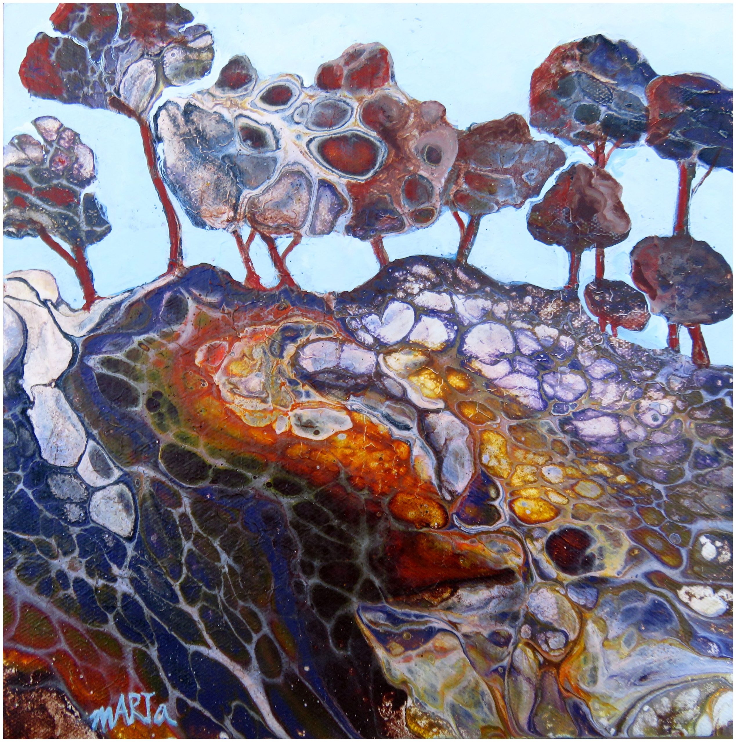 Trying to be adventures, I decided to experiment with Burnt Umber, Burnt Sienna, Vermillon, Orange, Purple and a small amount of Black and White for this pour. The results was a quite interesting pattern, the emerging cells reminding me of rocks and tree tops. After the pour had completely dried, I used negative painting to emphasize the tree tops . A sky blue colour was selected to paint around the tree crowns and the tree trunks to create this landscape.