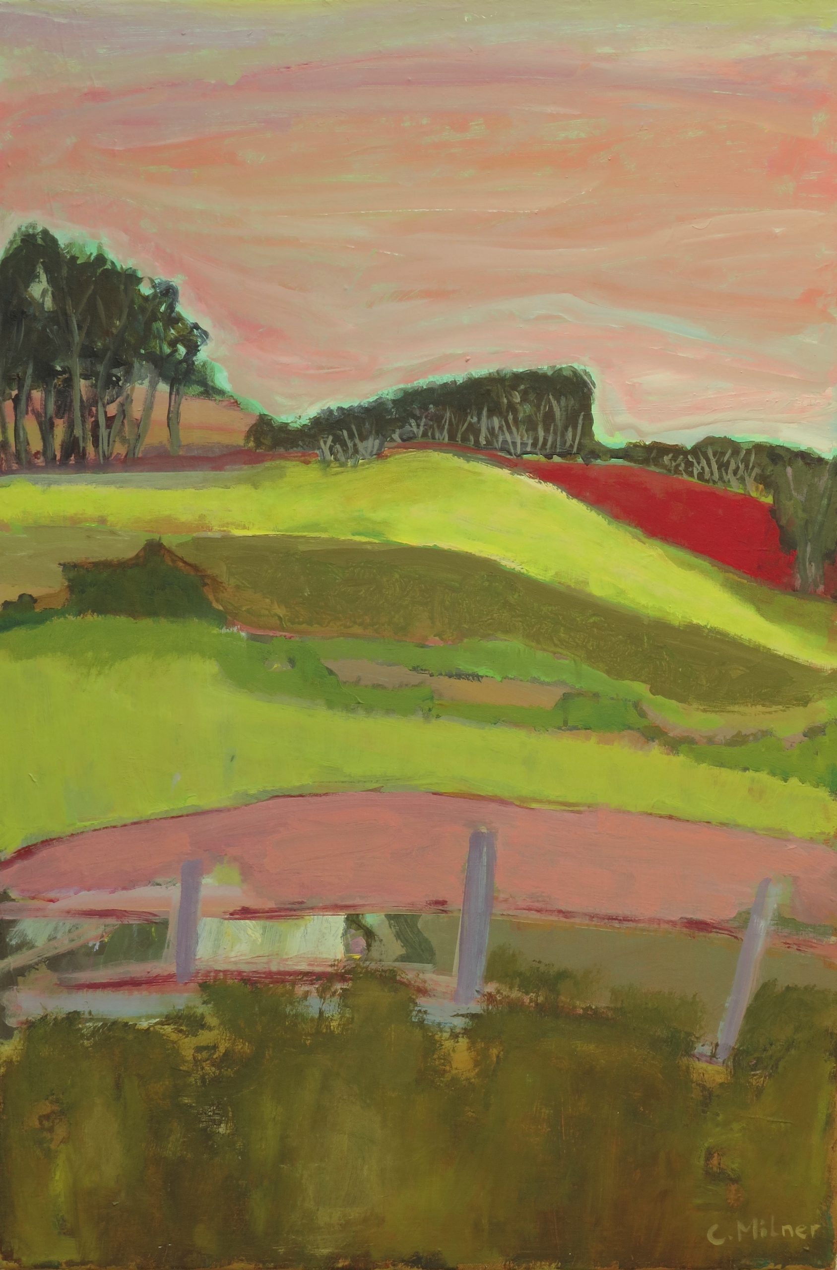 Semi abstract landscape painting featuring rolling green hills under a soft pink sky.