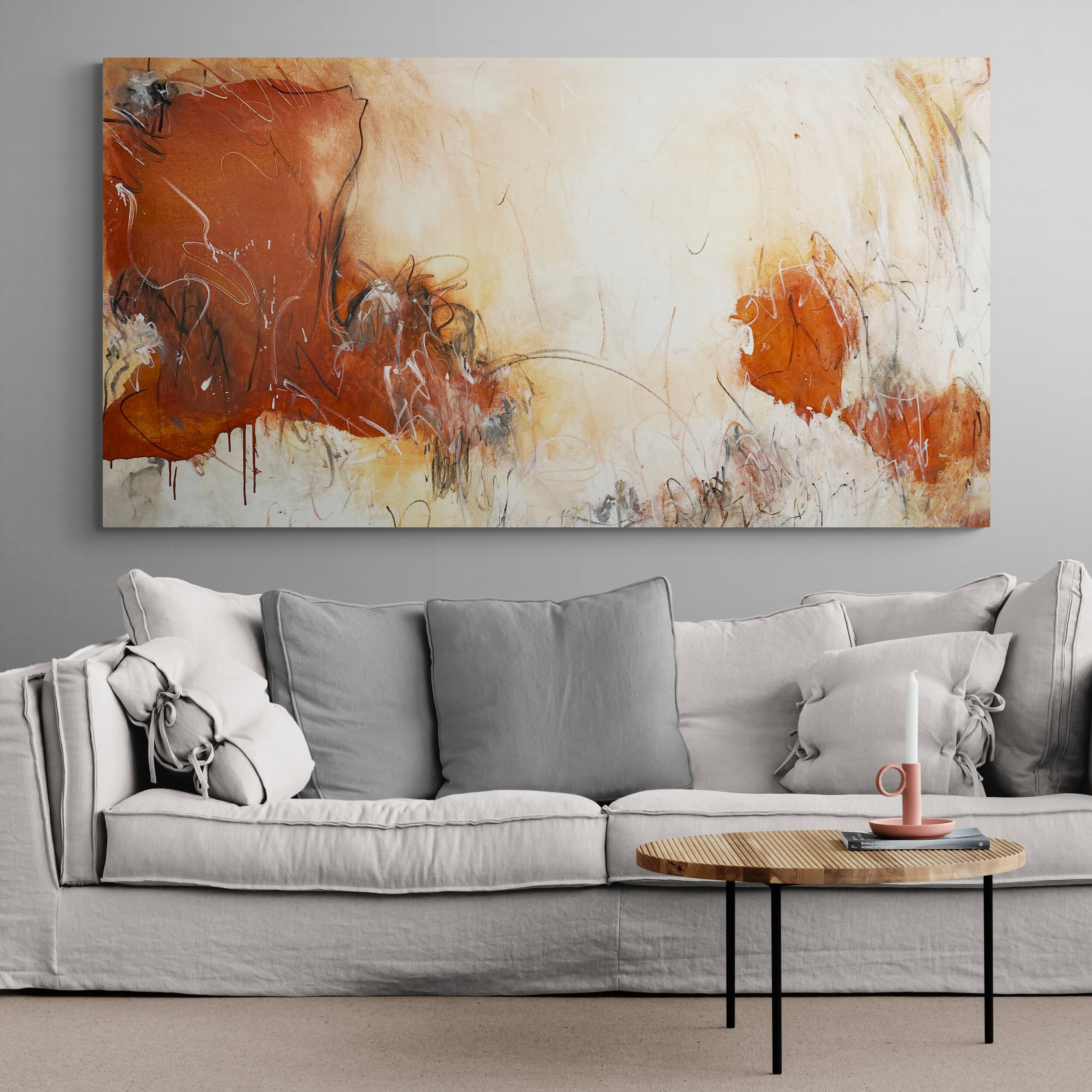 Wildfire is an original painting. It’s intriguing expressionist mark making combined with its restful and calm neutral palette is the perfect statement piece for a large space.