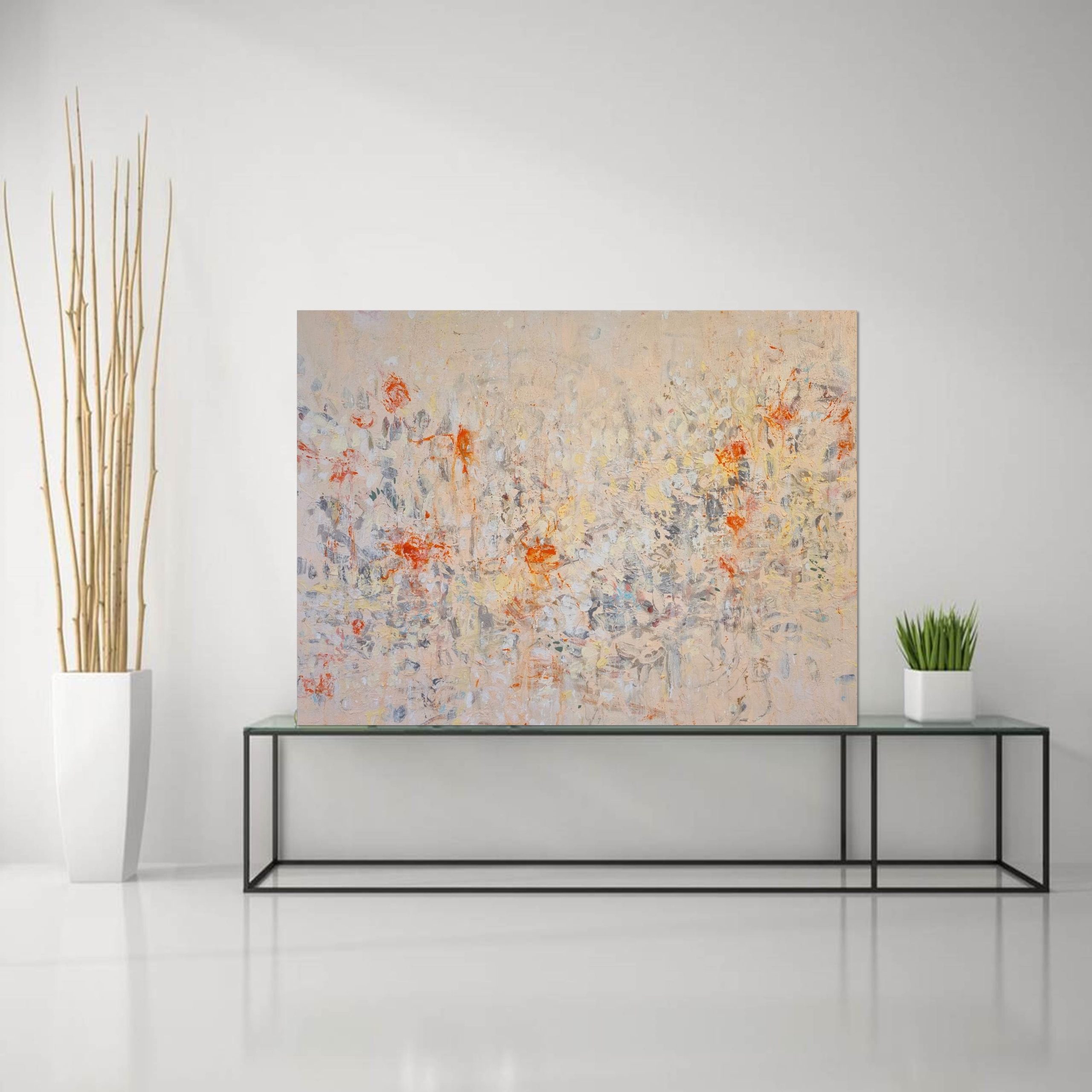 Shades, dilutions, washes of gentle earthy tones contrast with impasto effects in muted neutrals, tangerine, yellow, peach, sage and charcoal alongside subtle pops of sky blue.