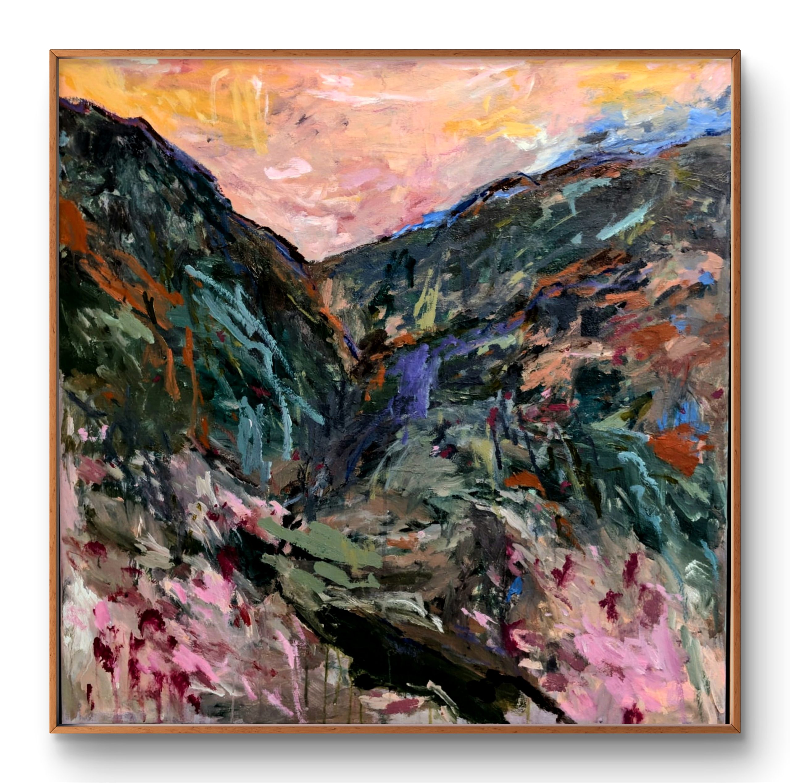 This original painting ‘Wildflower Valley’ by Virginia Hendren is a deeply expressive interpretation of a wild valley bursting with untamed beauty. Using bold, gestural brushstrokes and a richly layered palette, this piece has so much beautiful detail, with the viewer seeing something different every time. The painting captures a valley at dusk, where shadowed hills rise against a glowing sky, and wildflowers bloom freely in the foreground — vibrant pinks, deep reds, and soft purples suggesting a landscape alive with energy and colour.