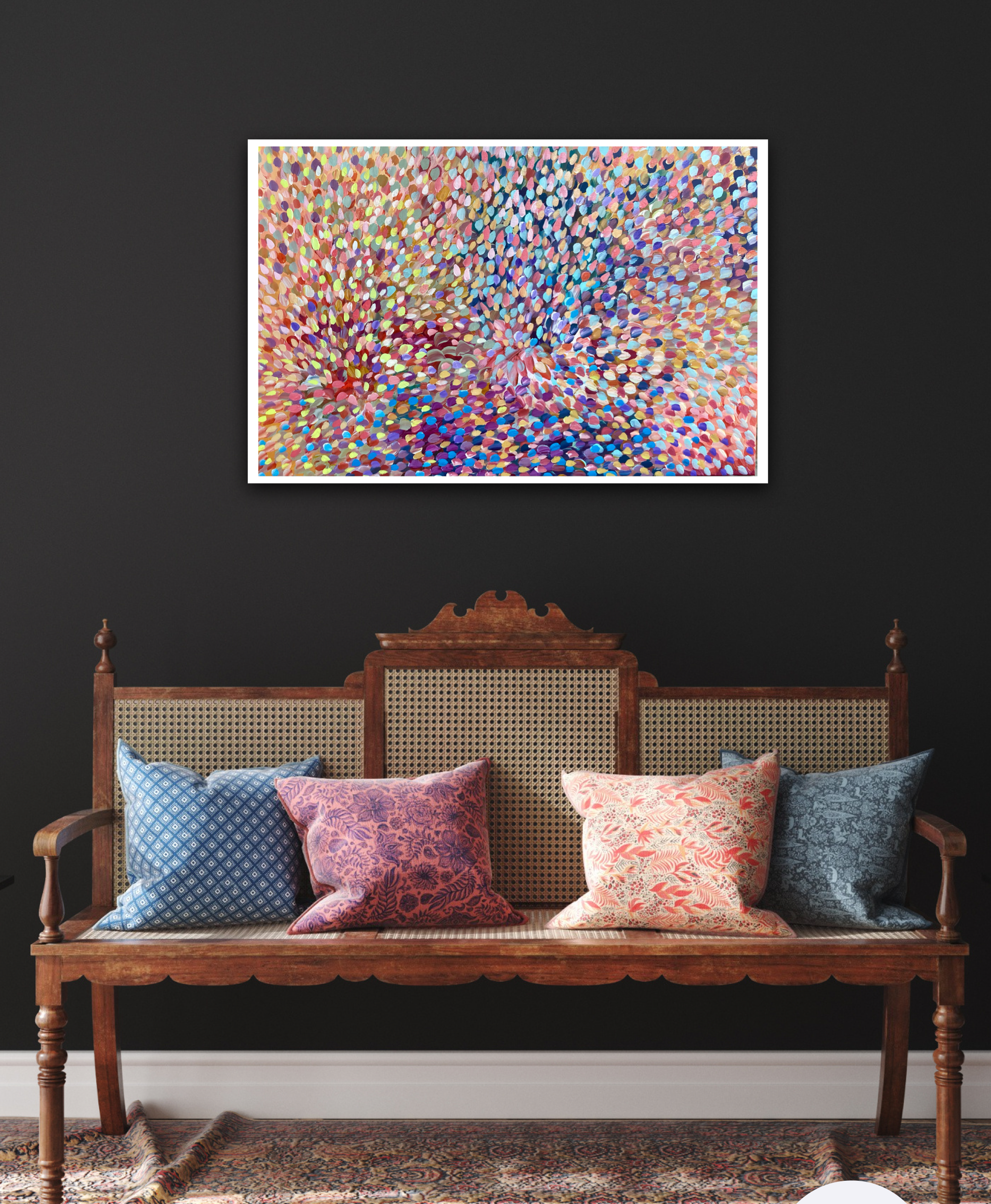 Wildflowers a painting with beautiful warm and cool colours of the fields. Petals swept by the wind creating this beautiful bouquet of rich colours covering the whole landscape . A composition of flowers and rhythms of petals dancing over the field like musical notes with cool blues and yellow , pinks , orange, purples. A very peaceful and tranquil painting with so much depth . This painting is painted with Oil paint and does not come with an external frame. The painting is signed and dated 2022 at the back and comes with a certificate of authenticity.