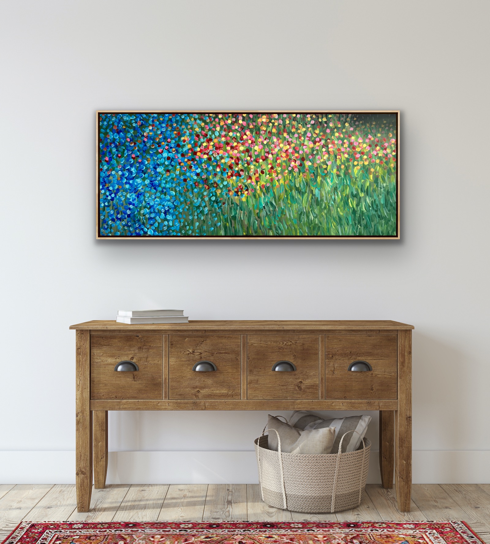 Wildflowers by Theo Papathomas – Â a painting with lots of layers of beautiful colours of flowers covering the fields. The landscape becomes a bouquet of petals dancing over the fields. I tried to create this beautiful composition of colours of the landscape of flowers and petals making a beautiful field of musical notes. Capturing the beautiful colours of the flowers , blues, orange, reds pinks and yellows of petals and greens of the grass. The field comes to life with the sounds of the flowers and petals creating movement and rhythms. The painting does not come with an external frame.The painting is signed and dated 2023 at the back and comes with a certificate of Authenticity.