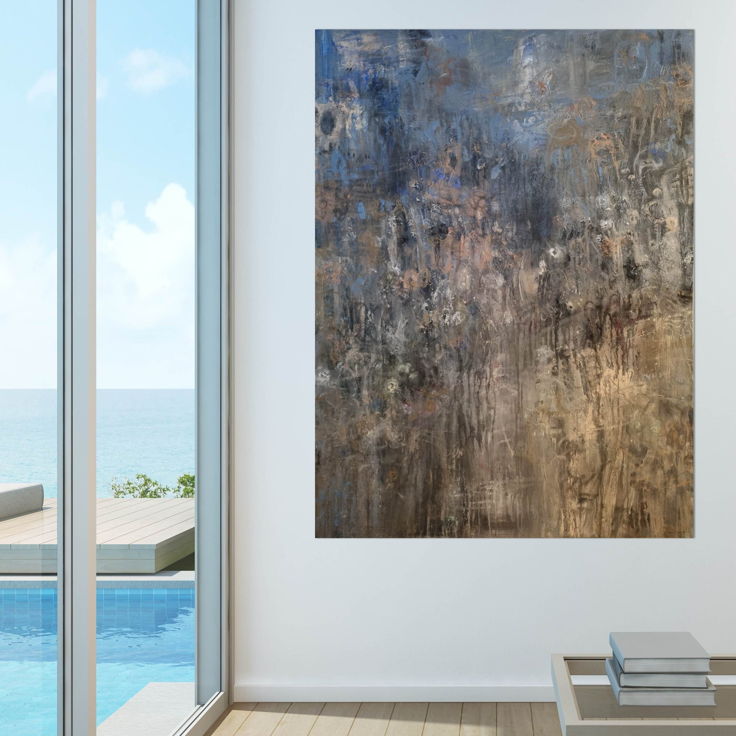 Shades, dilutions and pattern in muted blues, moss, stone, warm taupe and browns teamed with hints of berry, deep slate and winter white. Featuring expressive mark making and gestural brushwork this painting is contemporary and ambient in calming cool and warm neutral tones.