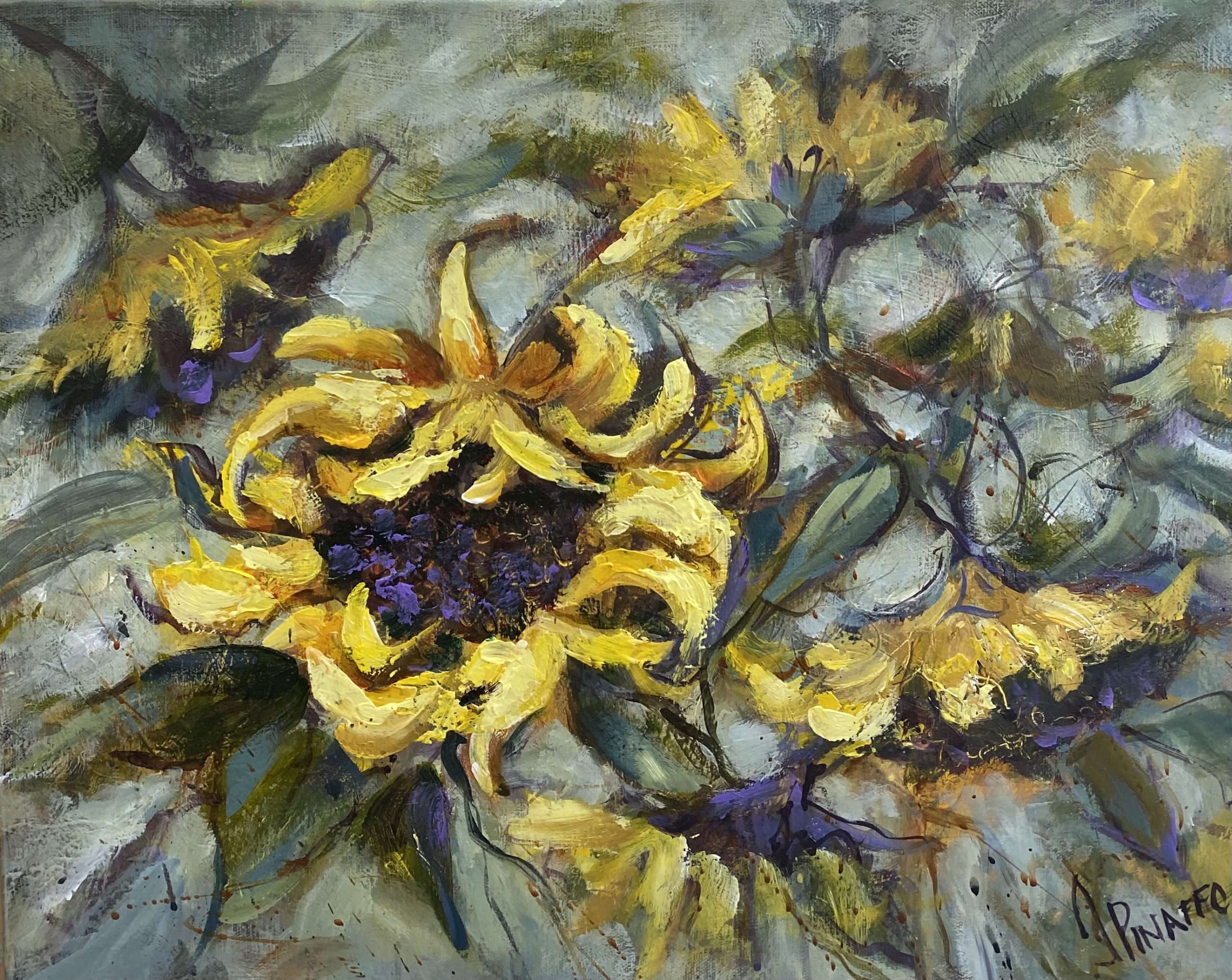 This painting is my interpretation of wind blown sunflowers. A semi abstract painting with beautiful warm colours.