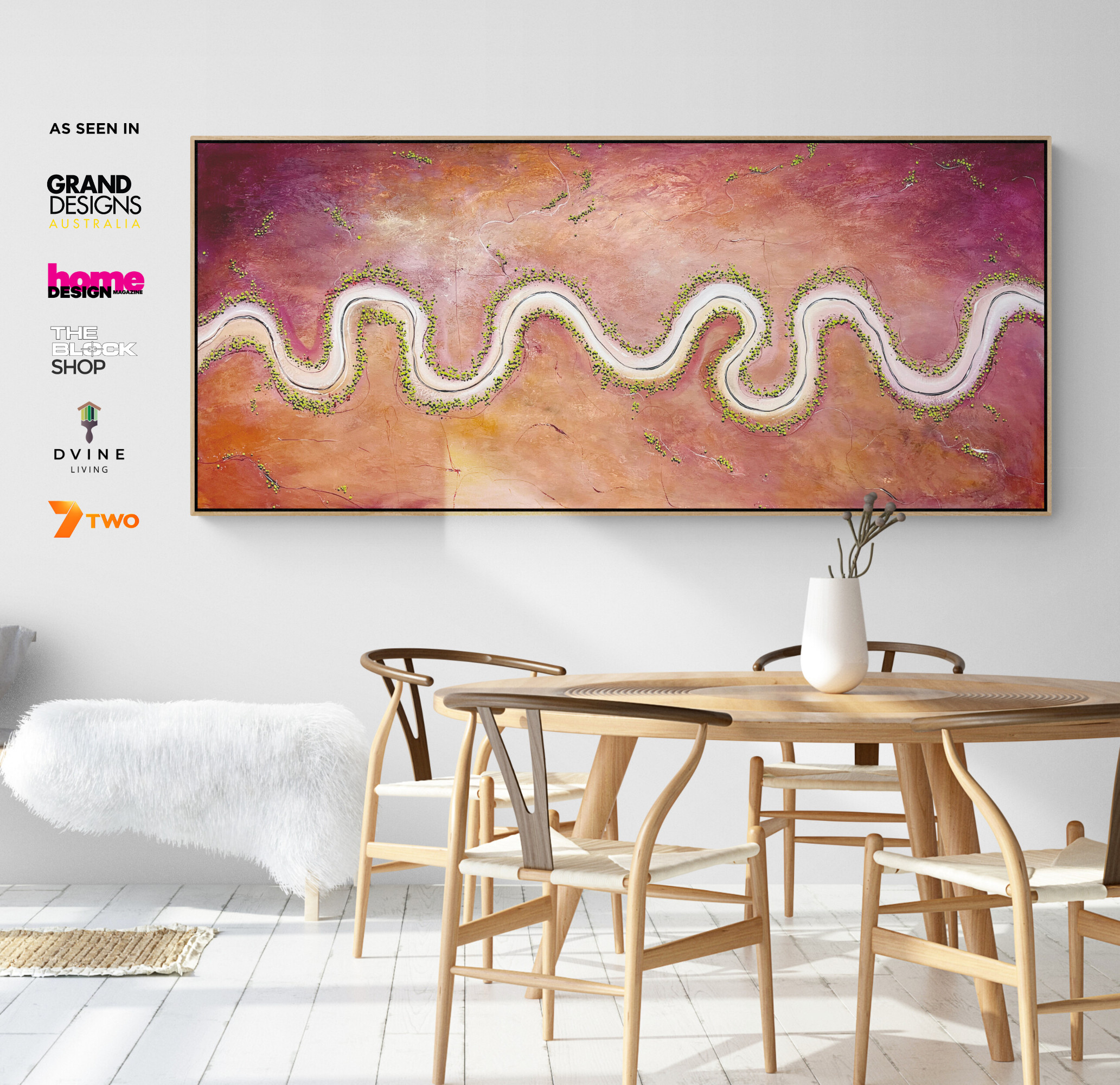 Winding River of Promise by Tania Chanter  In this textured aerial abstract landscape, the canvas unfolds in a captivating blend of burgundy, pink, blush, and soft yellow tones, creating a rich and harmonious visual experience. The scene is viewed from above, providing a unique perspective that accentuates the textured details of the composition.