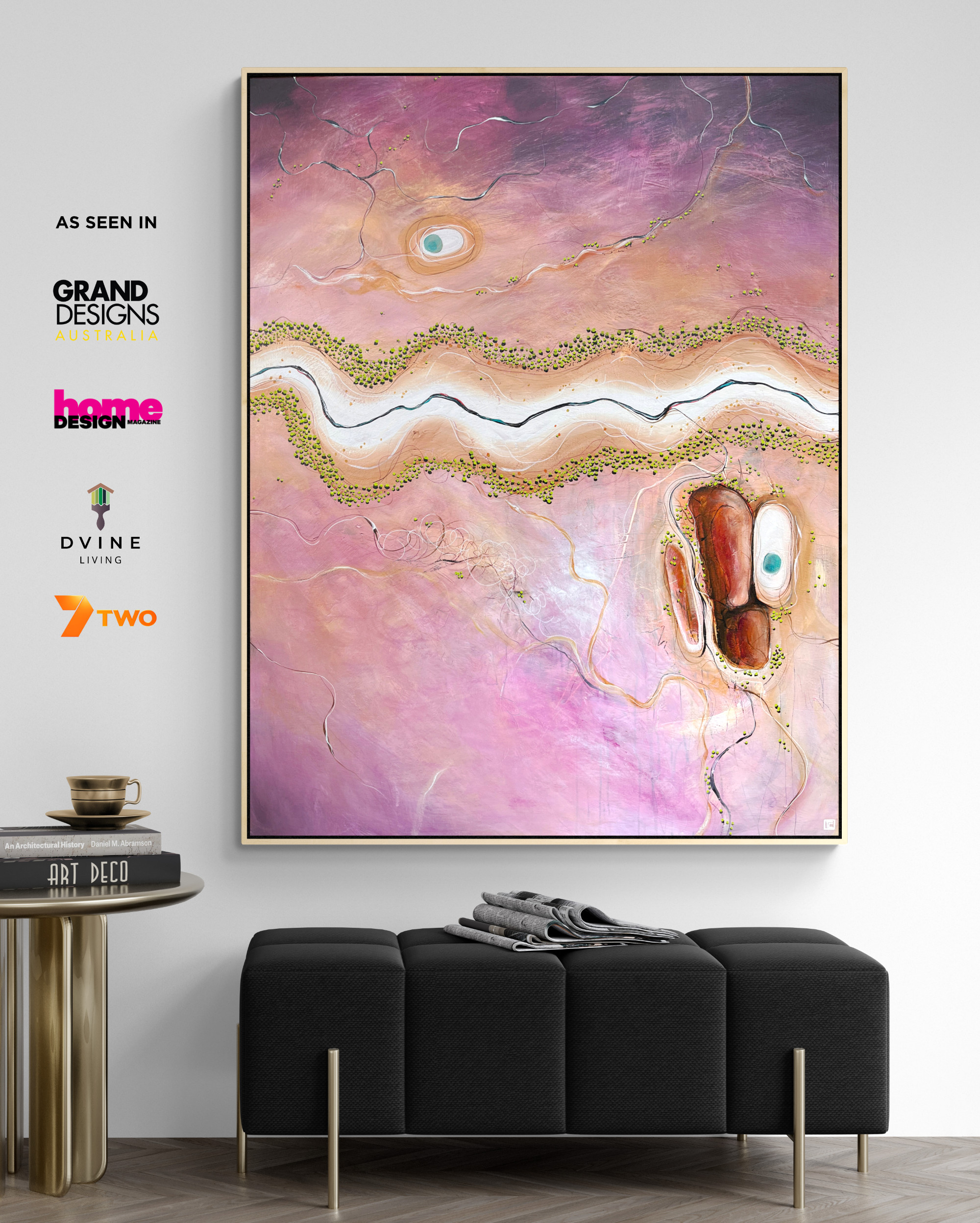 A river winds horizontally through the centre of the canvas, its meandering path cutting through the abstract landscape. The river is depicted with fluid strokes adding a sense of movement and flow to the composition, drawing the viewer’s gaze deeper into the artwork.