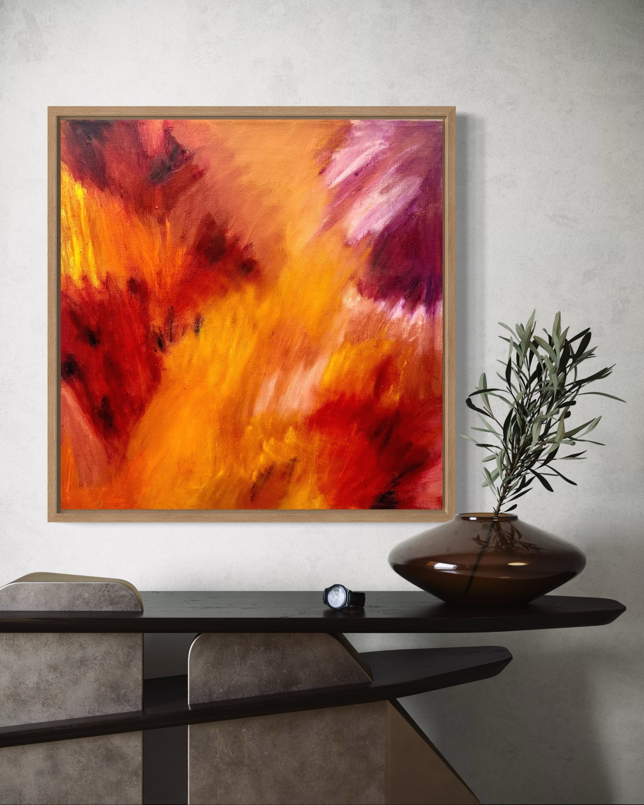Original artwork. Impasto Oil paint & oil sticks on stretched canvas FRAMED in an oak gallery shadow box frame. 50cm x 50cm.