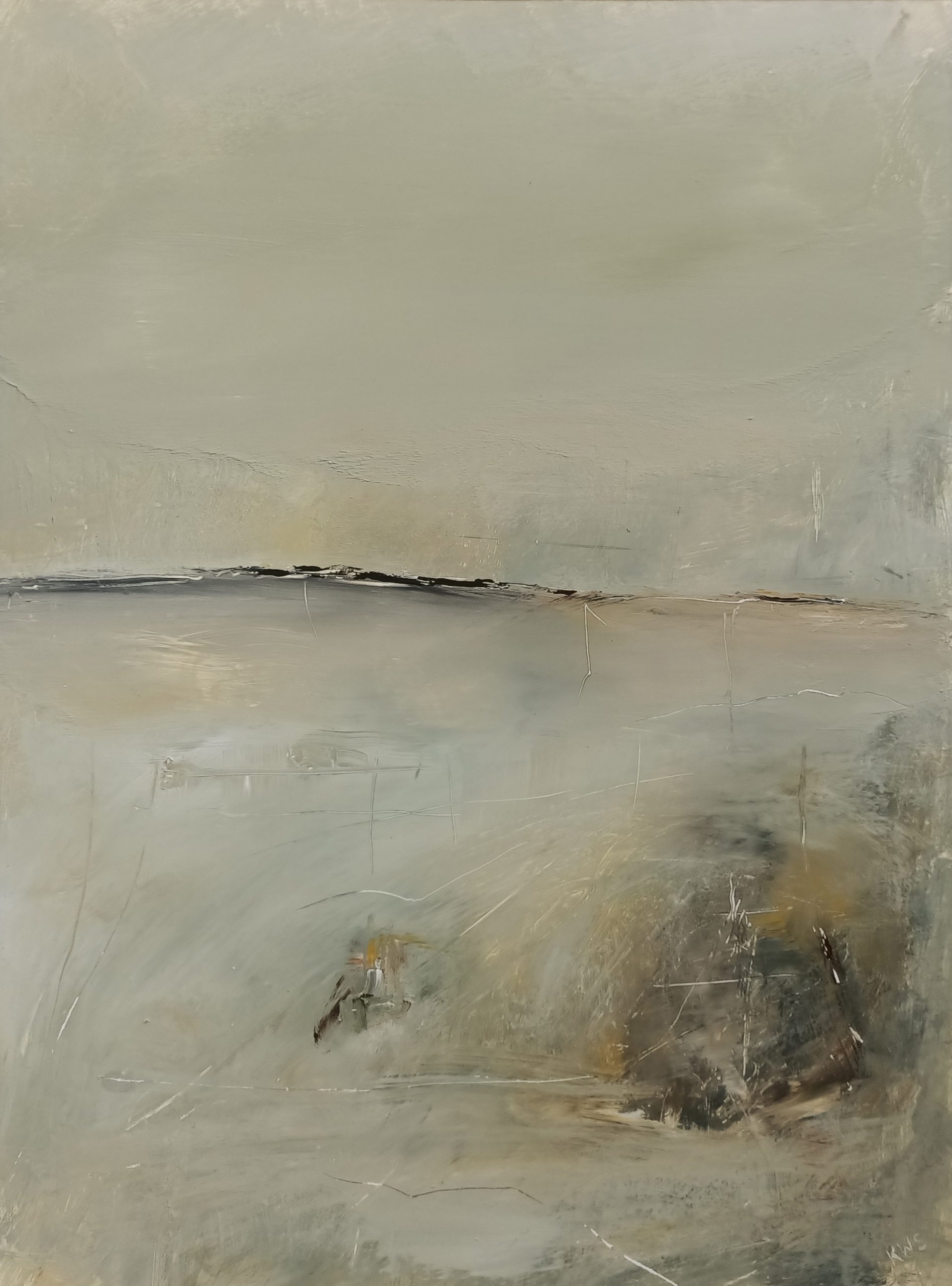 Subtle textures and tones have been used to establish a harsh landscape molded by wind and rain. The colour of the sky and ground are shrouded in a light olive green dust haze as the wind sweeps through the dry landscape.