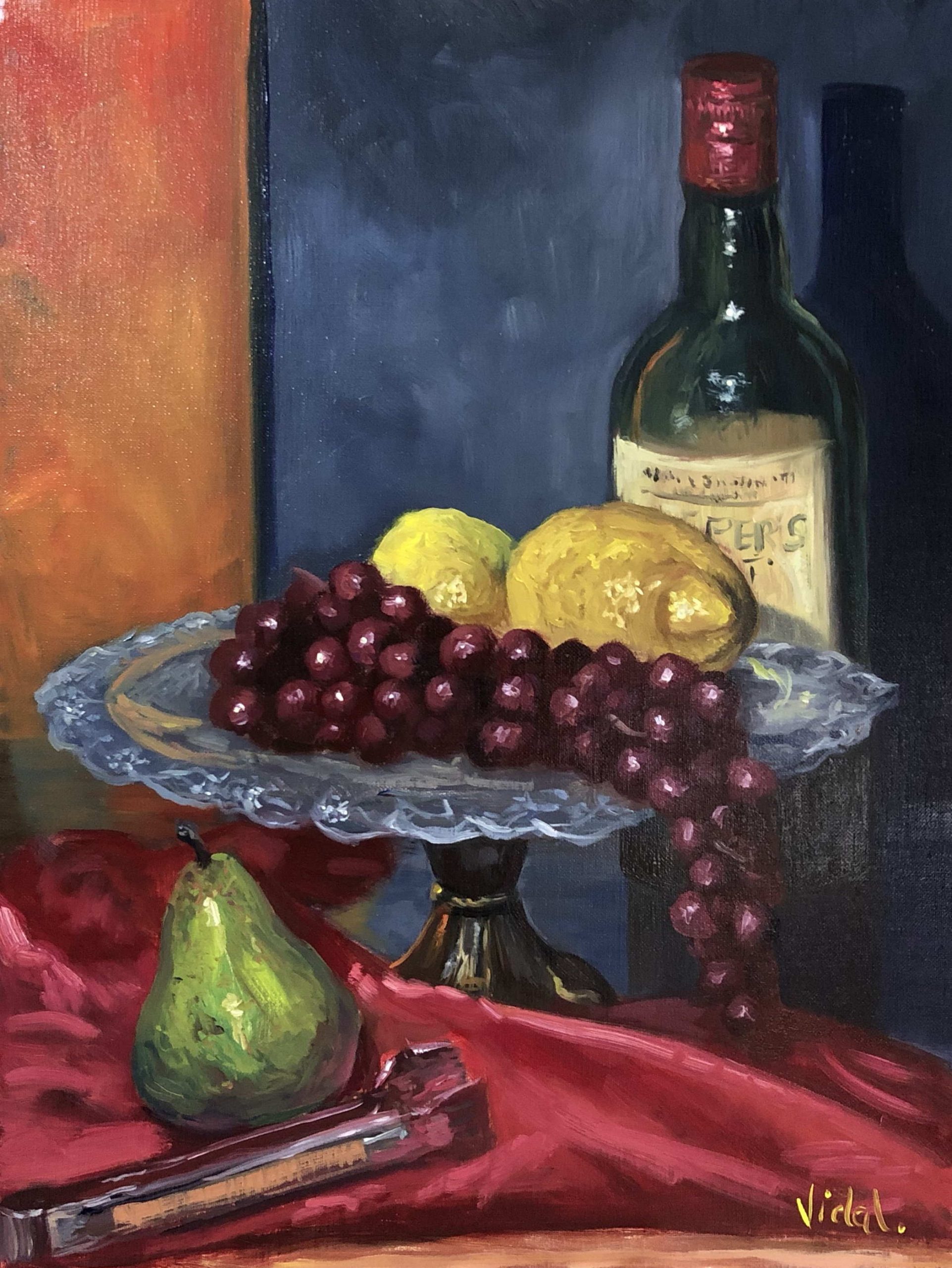 Wine, lemon, grapes, pear – still life by Christopher Vidal.