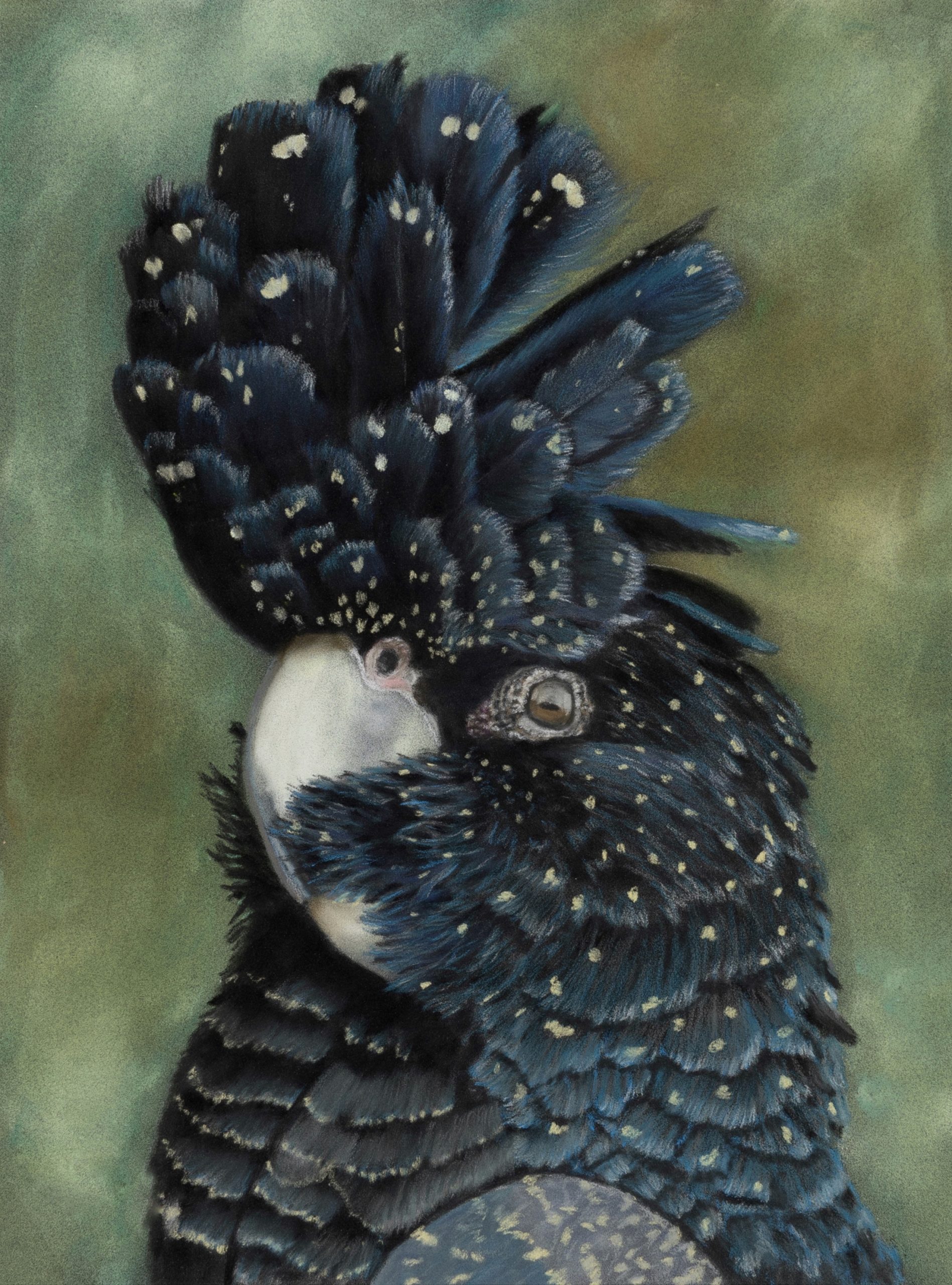 Winston by Katherine Jennings –  A pastel painting of the Australian Red Tail Black Cockatoo. These red tail black cockatoos are iconic Australian birds. The colours in the black are a favourite of mine to paint.