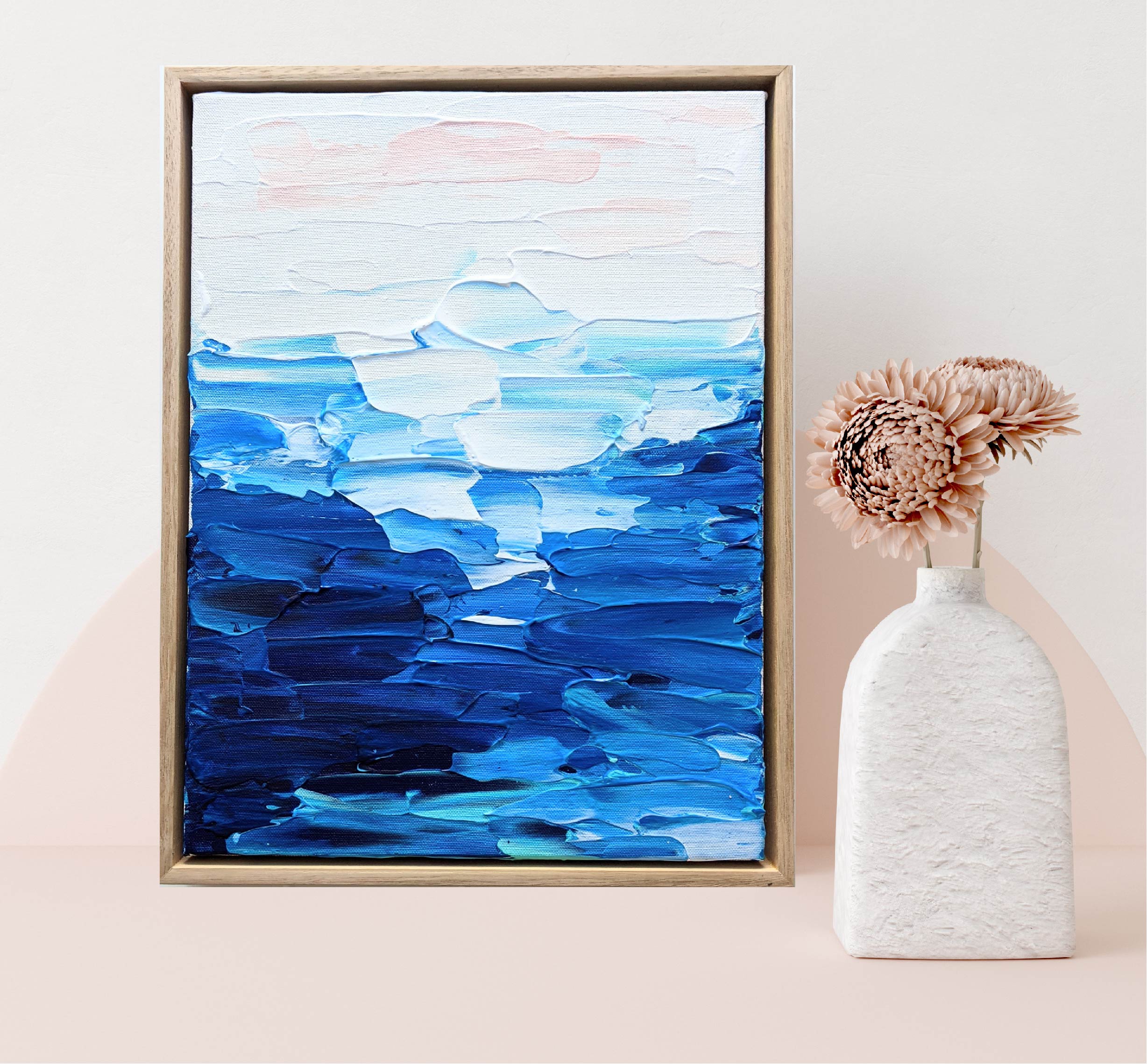 This artwork was inspired by my love affair with the ocean and it’s ever changing colour palette of blues with the pink of a sunset at the end of a beautiful day…