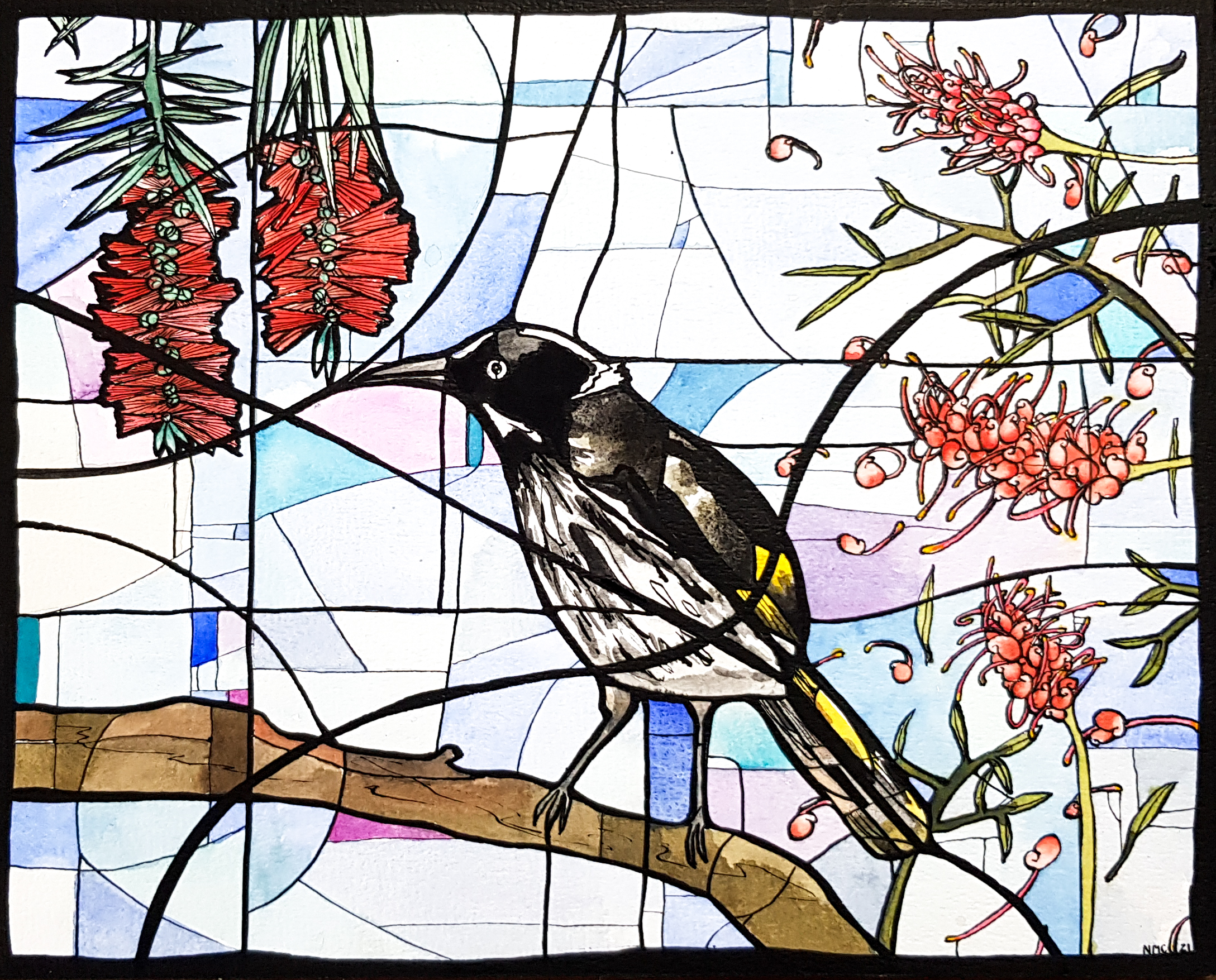 Winter Blooms is a watercolour and ink painting of the stunning bottlebrush and grevillea flowers with a beautiful New Holland Honeyeater.