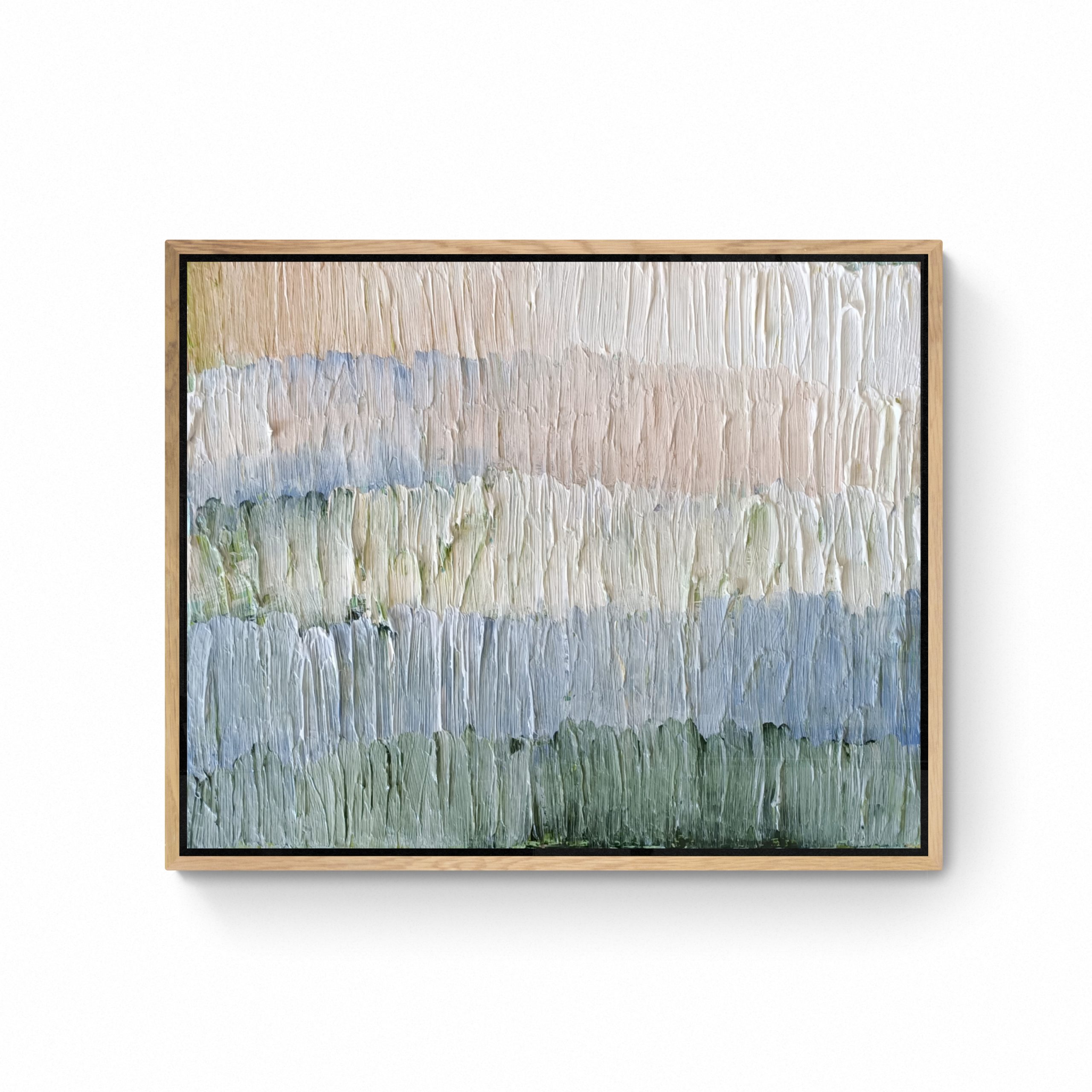 Highly textured work built up if many layers. Warm tones in a neutral pallet.