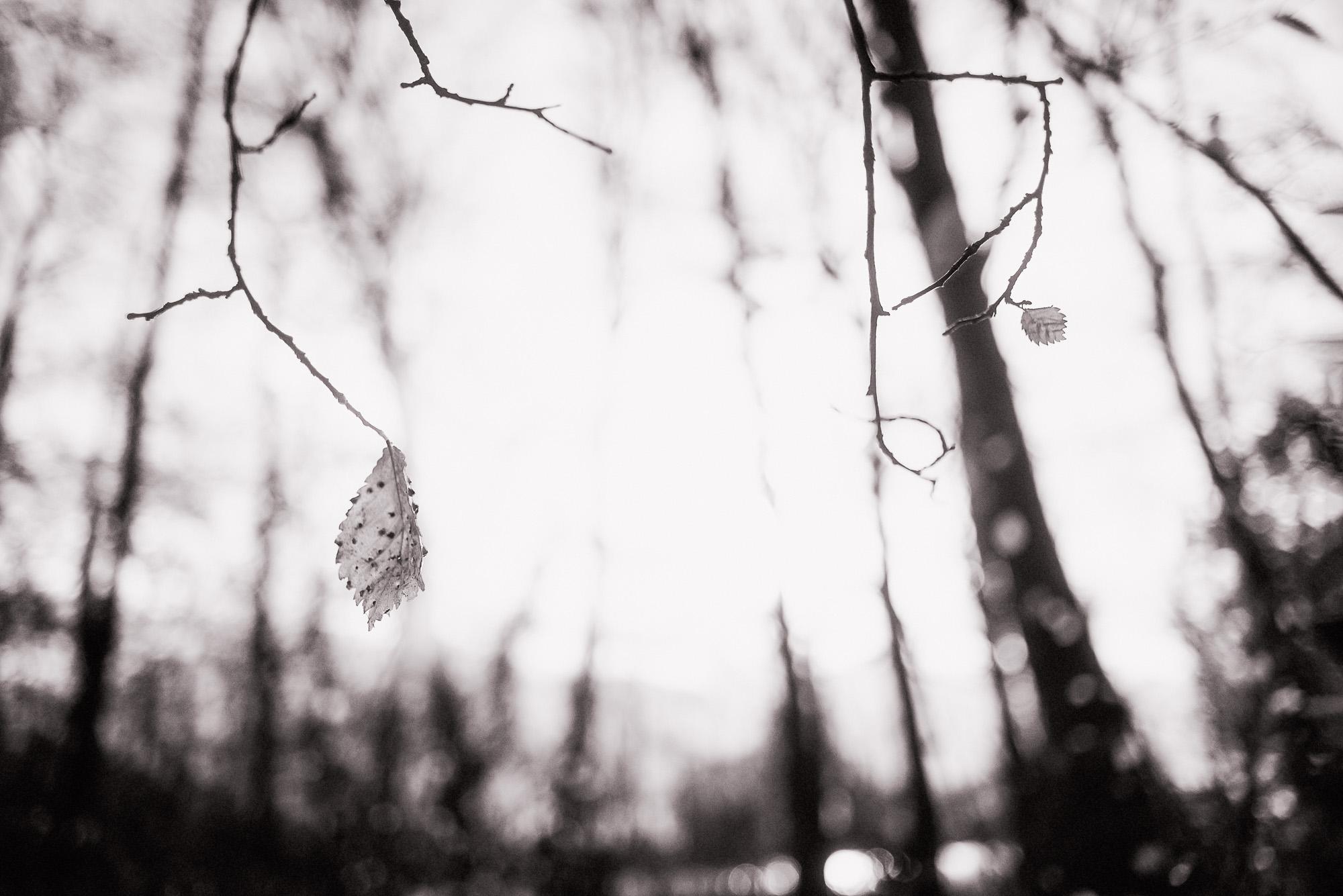 Most of the images in this series were taken in Europe and England over a few winters. Although there is a surprising variety of colours in the landscape all year round, I found the bare branches against the often-cloudy sky, made quite a monochromatic palette. I felt this lent itself to a black and white series to emphasise the simplicity and peacefulness of the naked trees. So often I notice in winter that there are still signs of life; leaves remaining from the previous summer or buds already growing in anticipation of the coming spring. I’m not sure the plants are dormant, I think they are quite awake all the time.