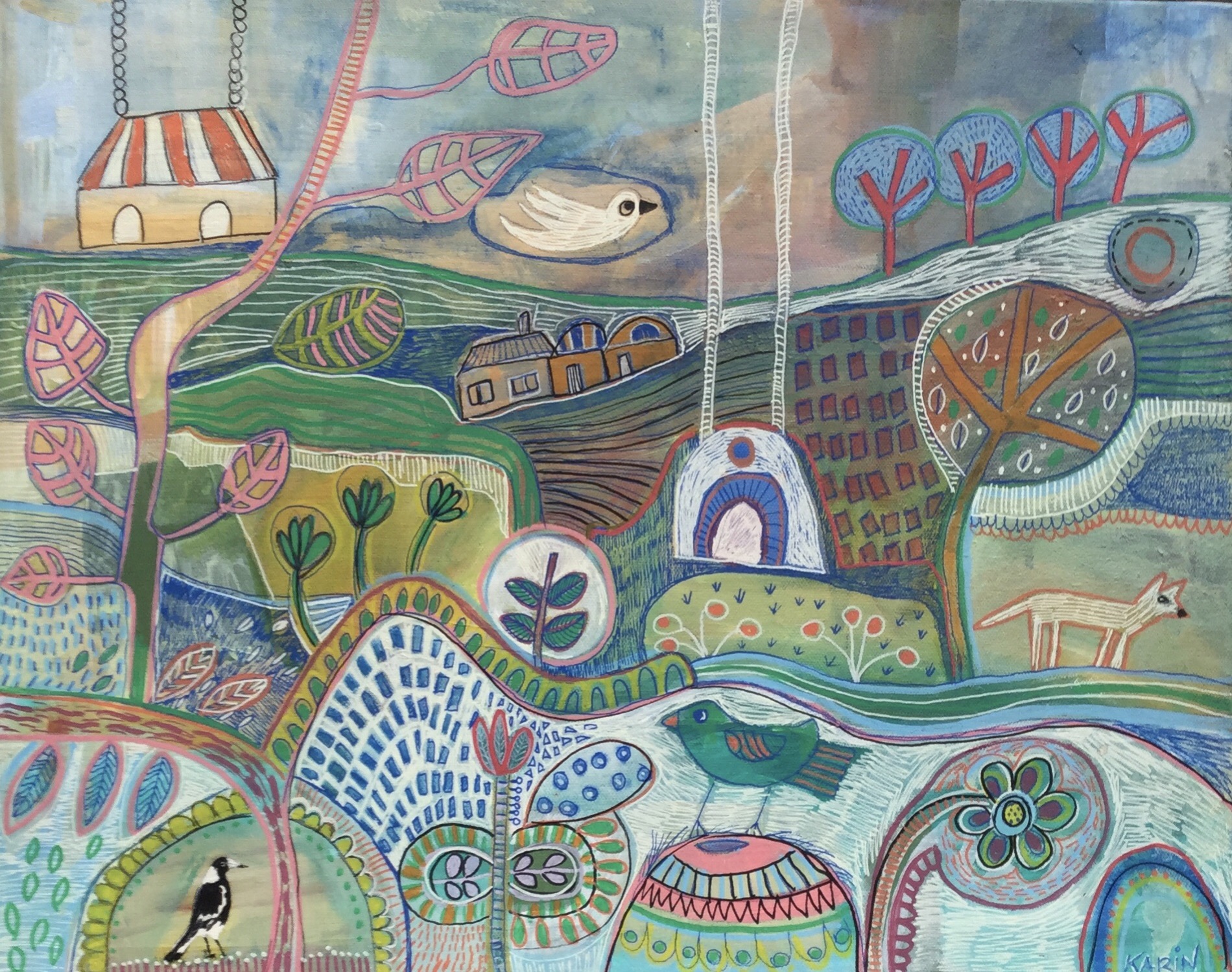 Winter Valley by Karin Hotchkin – is inspired by the Bickley Valley in the Hills of Perth W.A where I live. It is winter here now and it is cold, fresh, green and lush. Rolling hills, valleys of grass, orchards of trees with fruit, animals, and many birds. Iv selected cool colours like blues, greens and some soft pastel colours. All portrayed in a joyful fusion of naive and abstract shapes and patterns.