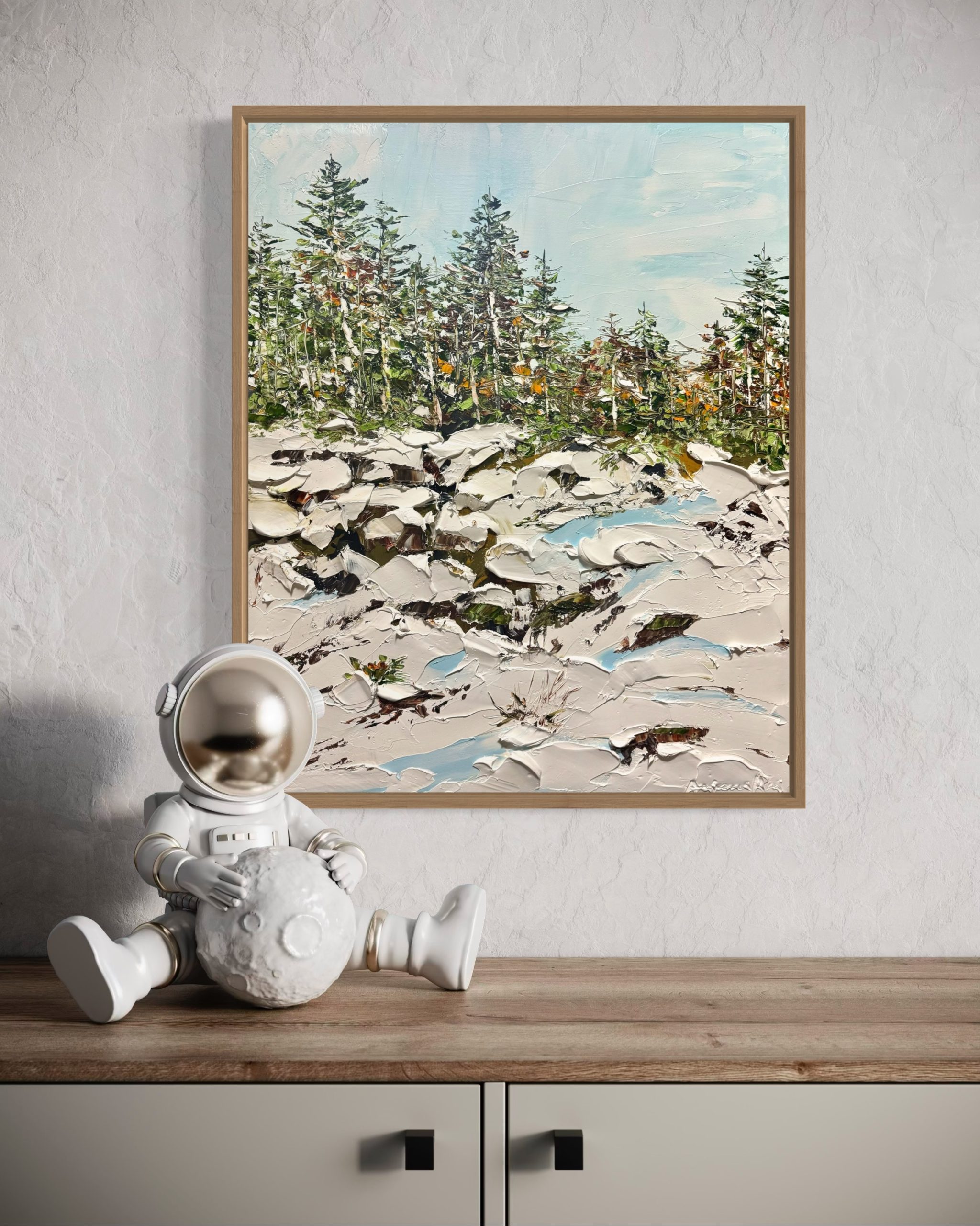 A serene winter landscape capturing frosted pines under a pale sky. The textured knife strokes evoke a sense of calm and solitude, inviting viewers to explore the beauty of nature’s quiet moments.