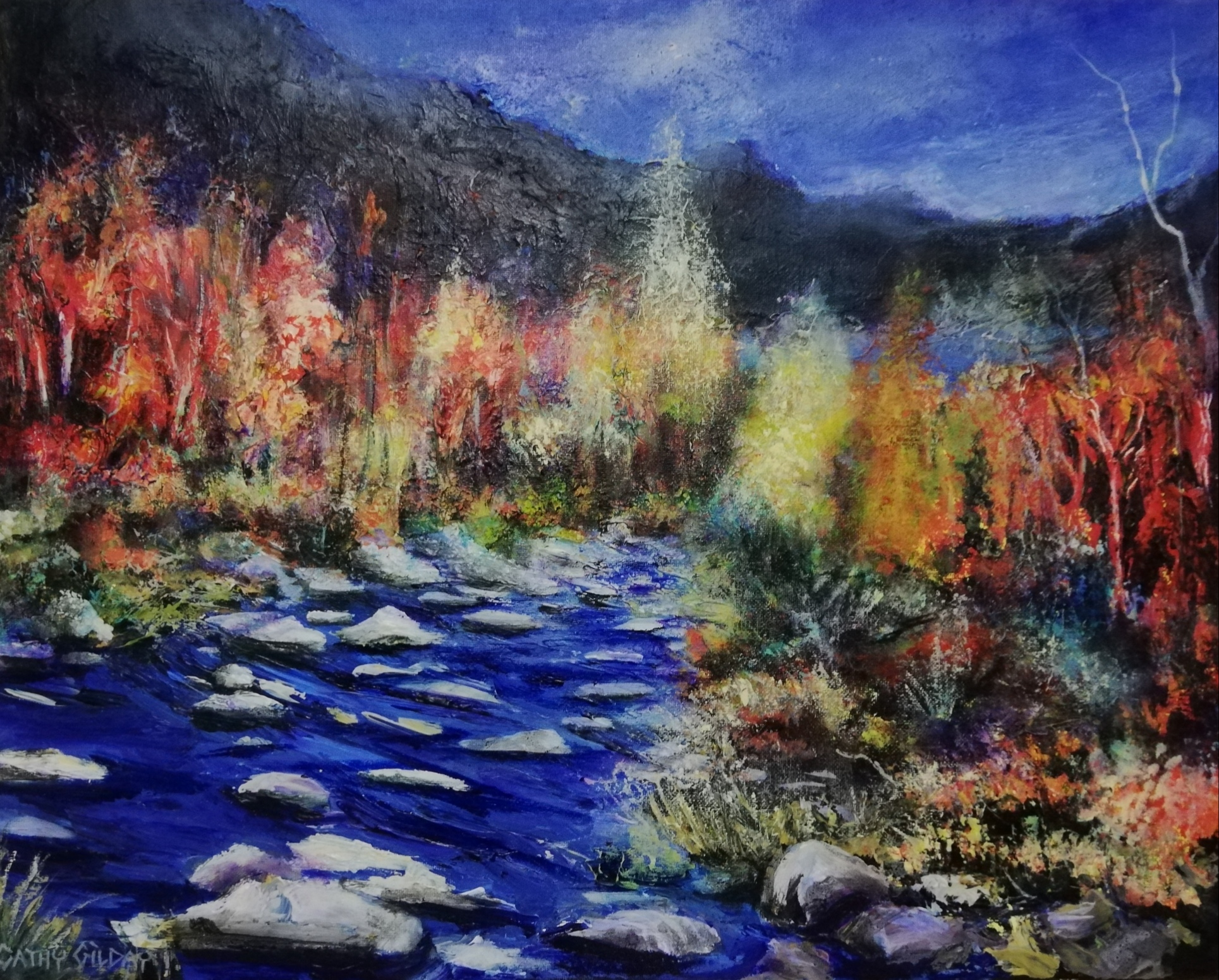 Heavy textured paint and a brightly coloured palette was used to depict this wintery landscape! This painting has been framed in a black floating frame, which brings the overall measurements to 43.5 x 53.5 x 3.5cm.