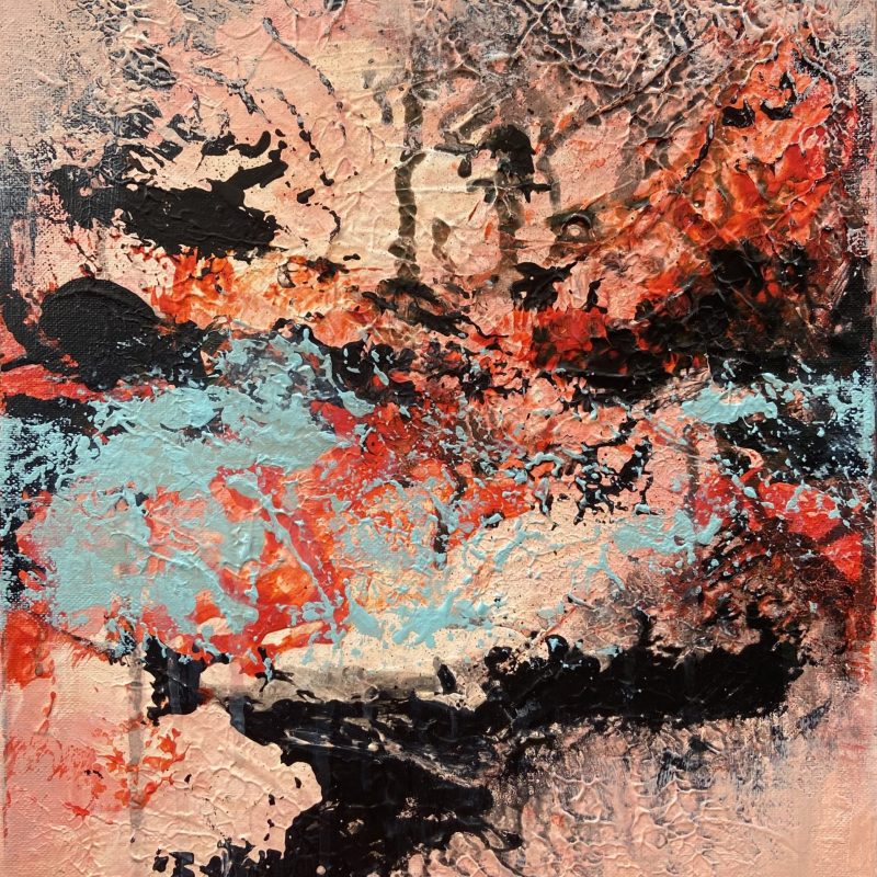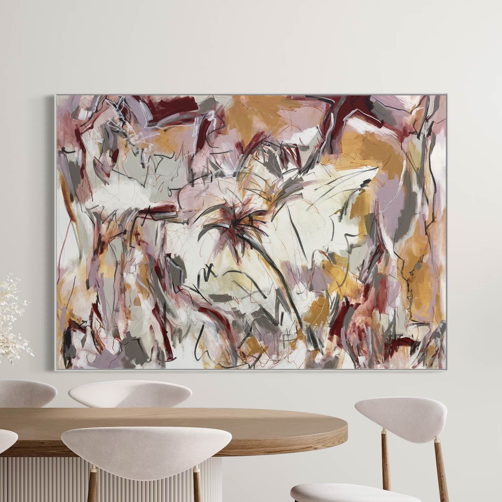 This stunning original acrylic abstract has areas of bold thin washes and subtle gestural marks across the canvas surface. It’s striking palette consists of white, beige, grey, black, crimson, maroon ,tan, ochre and shades of blush pink.