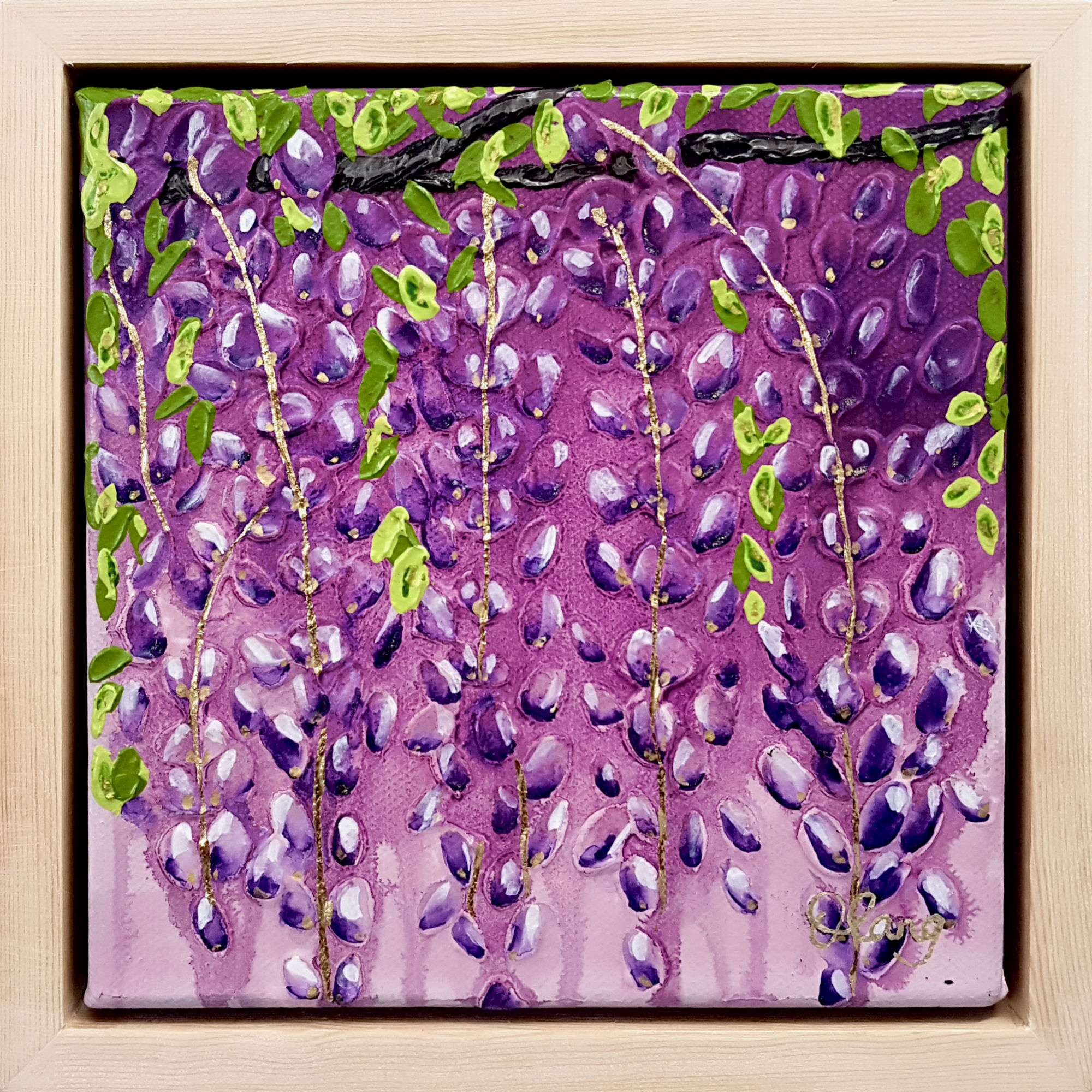Hand painted on stretched canvas with a beautiful purple palette it has textured impasto Wisteria petals and leaves on gold leaf vines.