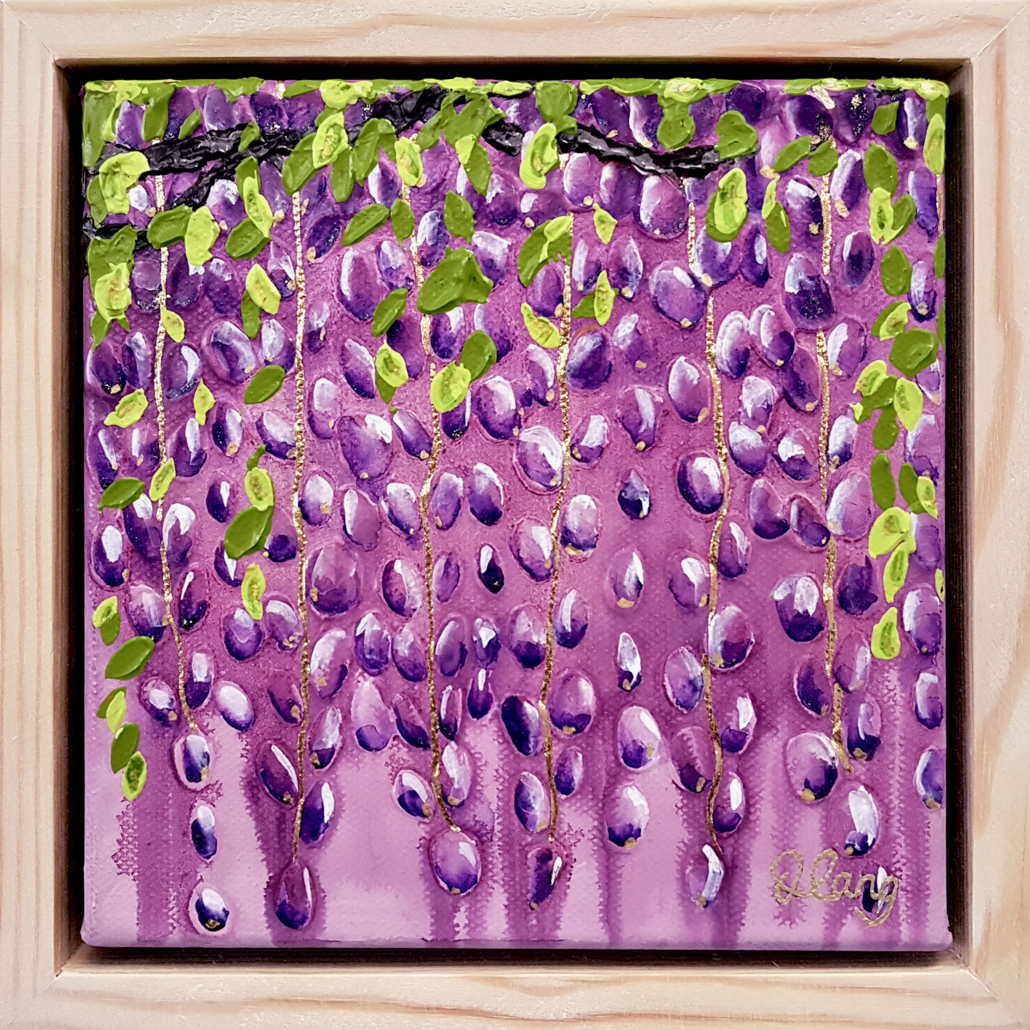 Hand painted on stretched canvas with a beautiful purple palette it has textured impasto Wisteria petals and leaves on gold leaf vines.
