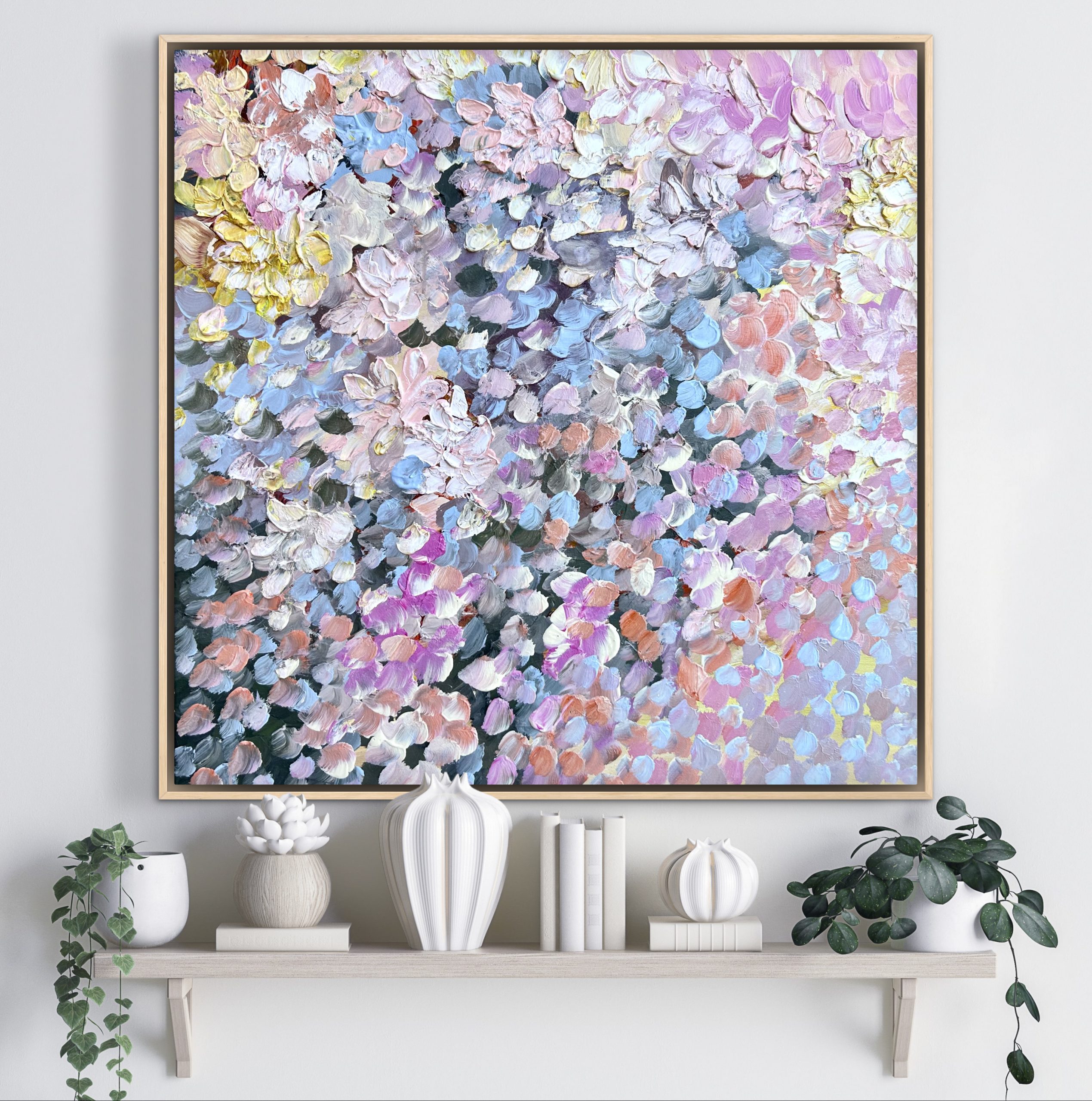 is a painting with warm colours of flowers and petals flying in the wind creating weeping over the garden with lots of layers of acrylic paint and lots of texture . Flowers and petals, weeping over the garden creating so much movement and rhythms . A very peaceful and tranquil painting with so much depth. The painting does not come with an external frame.The painting is signed and dated at the back and comes with a certificate of Authenticity.