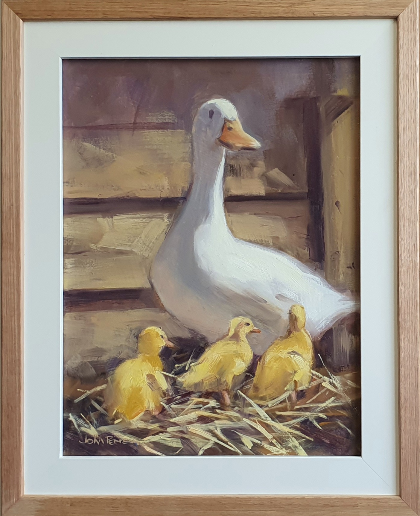 Original oil painting by John Pearson captures a tender moment in a nest with mommy goose and her three chicks