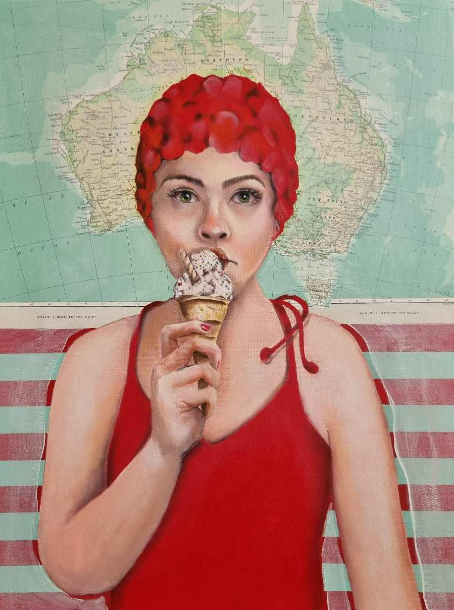This work is reminiscent of a bygone era, when we stayed in the sun all day lathering our bodies with baby oil.  It has an original vintage maps showing part of the Victorian coast line in the background.  It reminds us of a time when the car would be overloaded with kids and legs would stick to the vinyl seats because of the heat.  This is part of  body of work that takes a contemporary took on an innocent and carefree time and place in Australia.