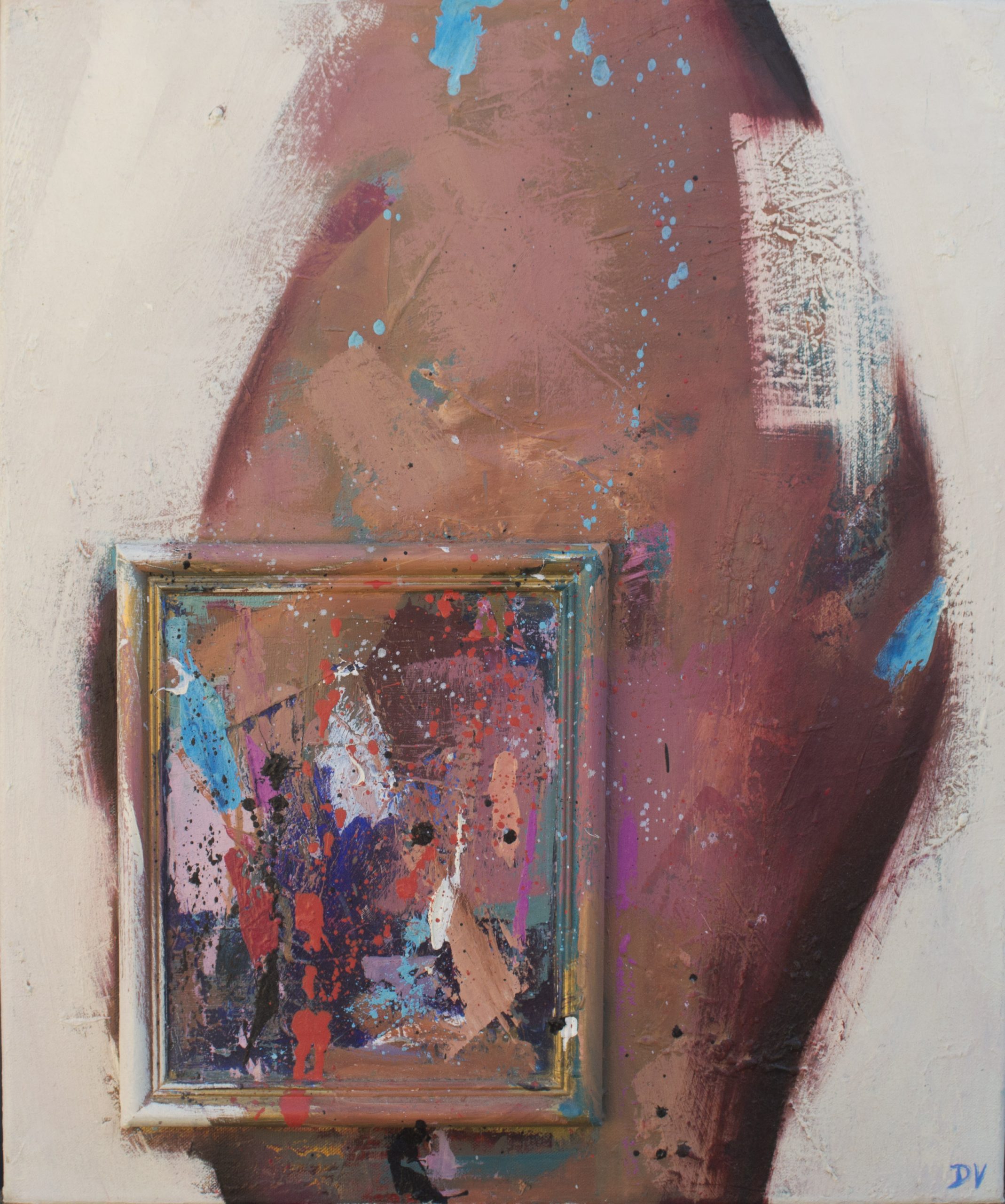 A reflective piece that has a small wooden frame attached to the canvas. Like a window to the soul where the contents within the frame are reflected outside the frame.