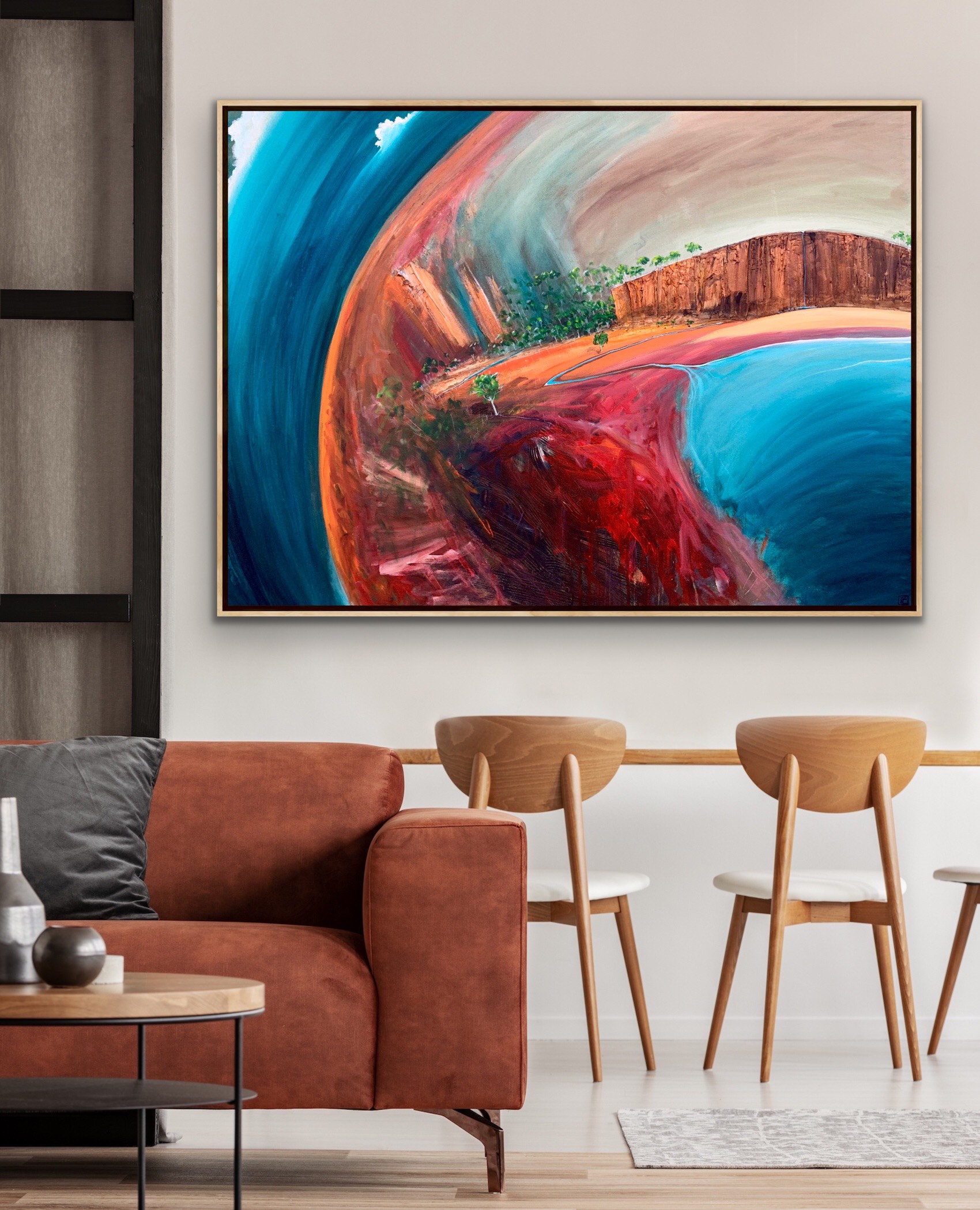 Wonder Bay Shore by Tania Chanter is an original abstract inspired by the Australian landscape. Ablaze with rich earthy tones of red, brown and teal.