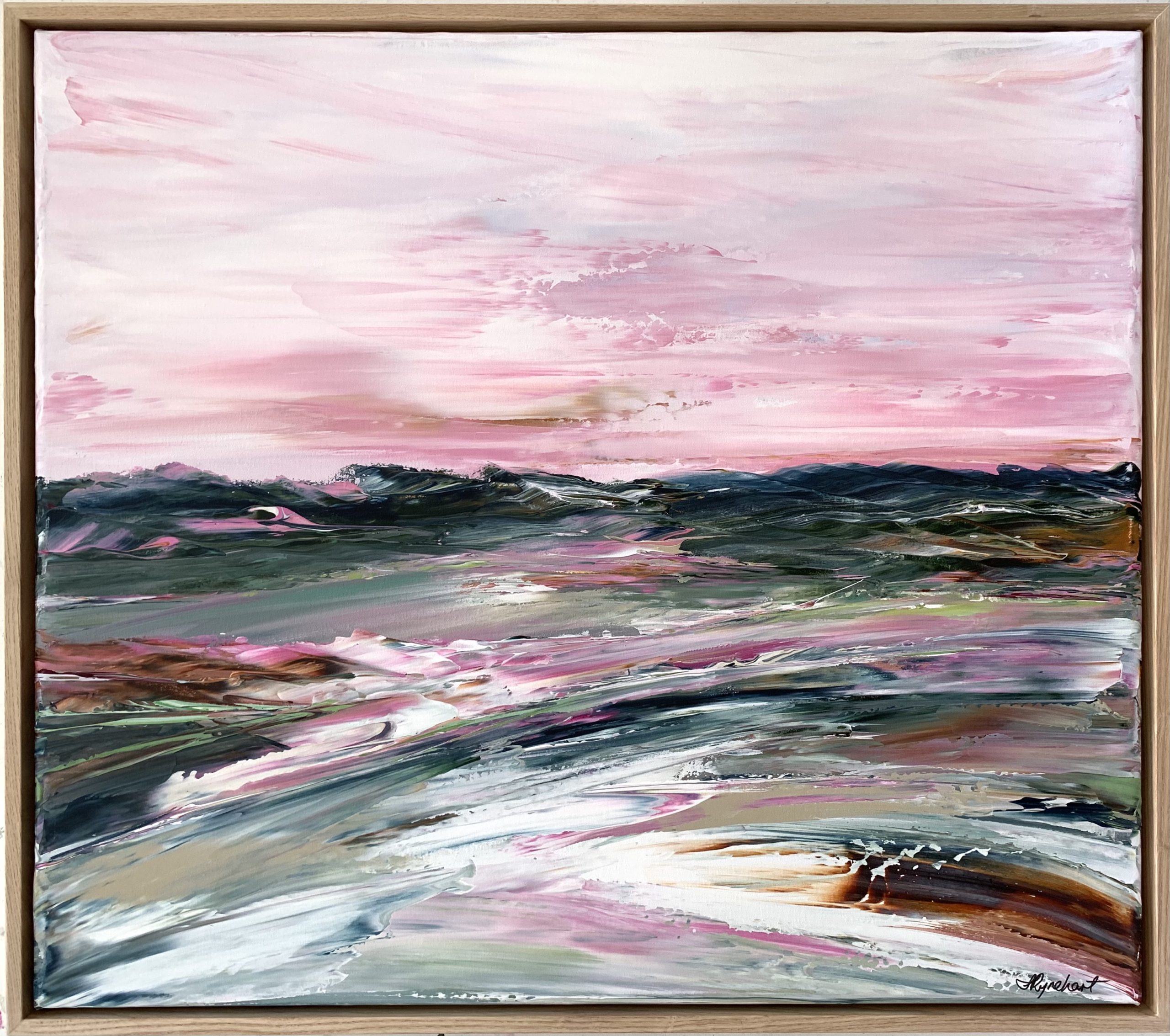 Wonderment by Sharon Rynehart – This striking landscape causes me to wonder. To wonder about all the things that could be, the promise of hope, the belief of faith over fear, brighter new beginnings. An immersion of gorgeous pinks and contrasting greens, blues and siennas – an artwork encompassing sea/land/sky in all it’s glory.