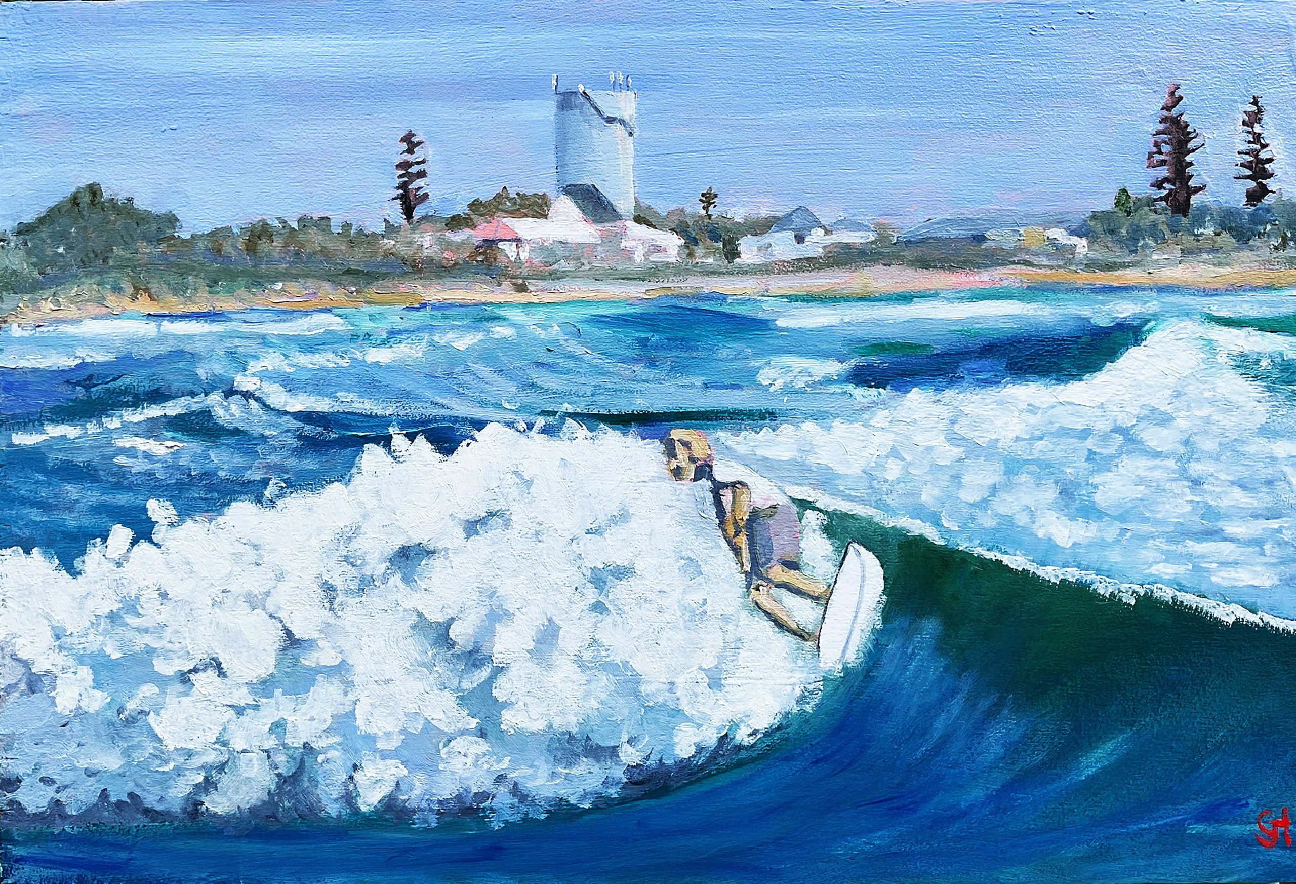 Wooli Left by Geoff Hargraves – A view of a surfer at Wooli riding a left breaking wave with a view of the water tower in the background. Oil on wood panel, sides white, wire across the back, ready to hang.