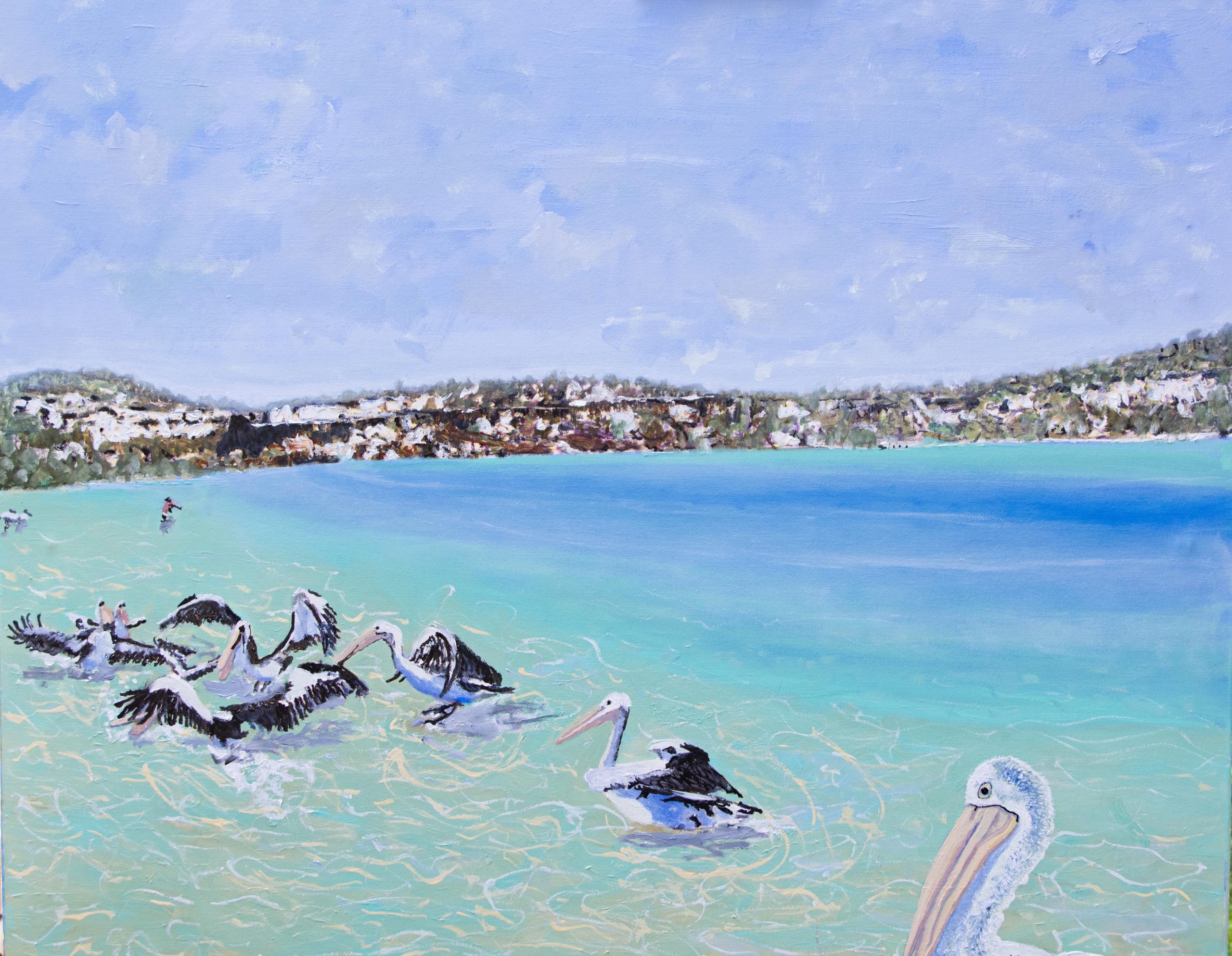Wooli River at high tide, The Pelicans congregate around the fish cleaning table when the fishing boats arrive and wait for the fisherman to throw scraps. Sides white, unframed, ready to hang with a wire across the back.