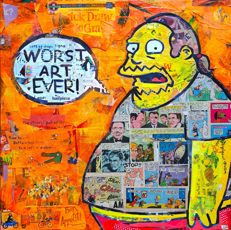 His T-shirt is made almost entirely from vintage comic books. An old damaged board game has also contributed a few Simpsons related elements. A whole bunch of The Simpsons characters make an appearance somewhere throughout this piece.