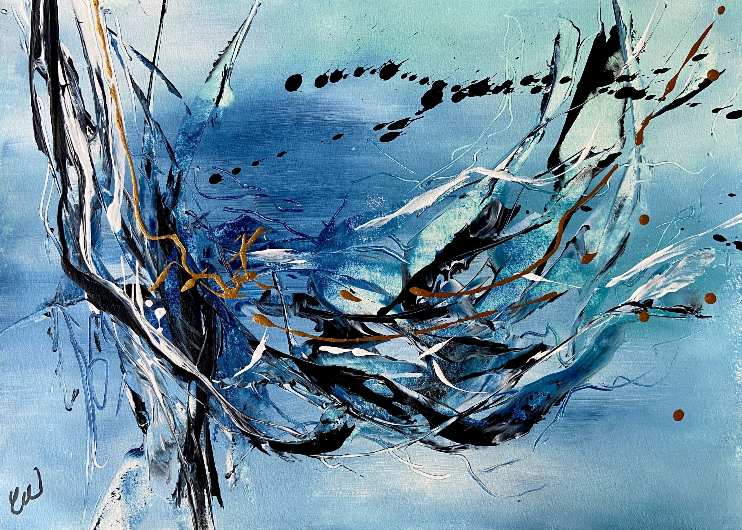 Worth The Wait by Carrie Welsh is an absolutely beautiful abstract piece that has lots of depth, life and movement captured within it. 29.7 x 42 cm (A3 size) Acrylic on paper. Requires framing. (Some images show what this piece looks like framed. Frames not included)