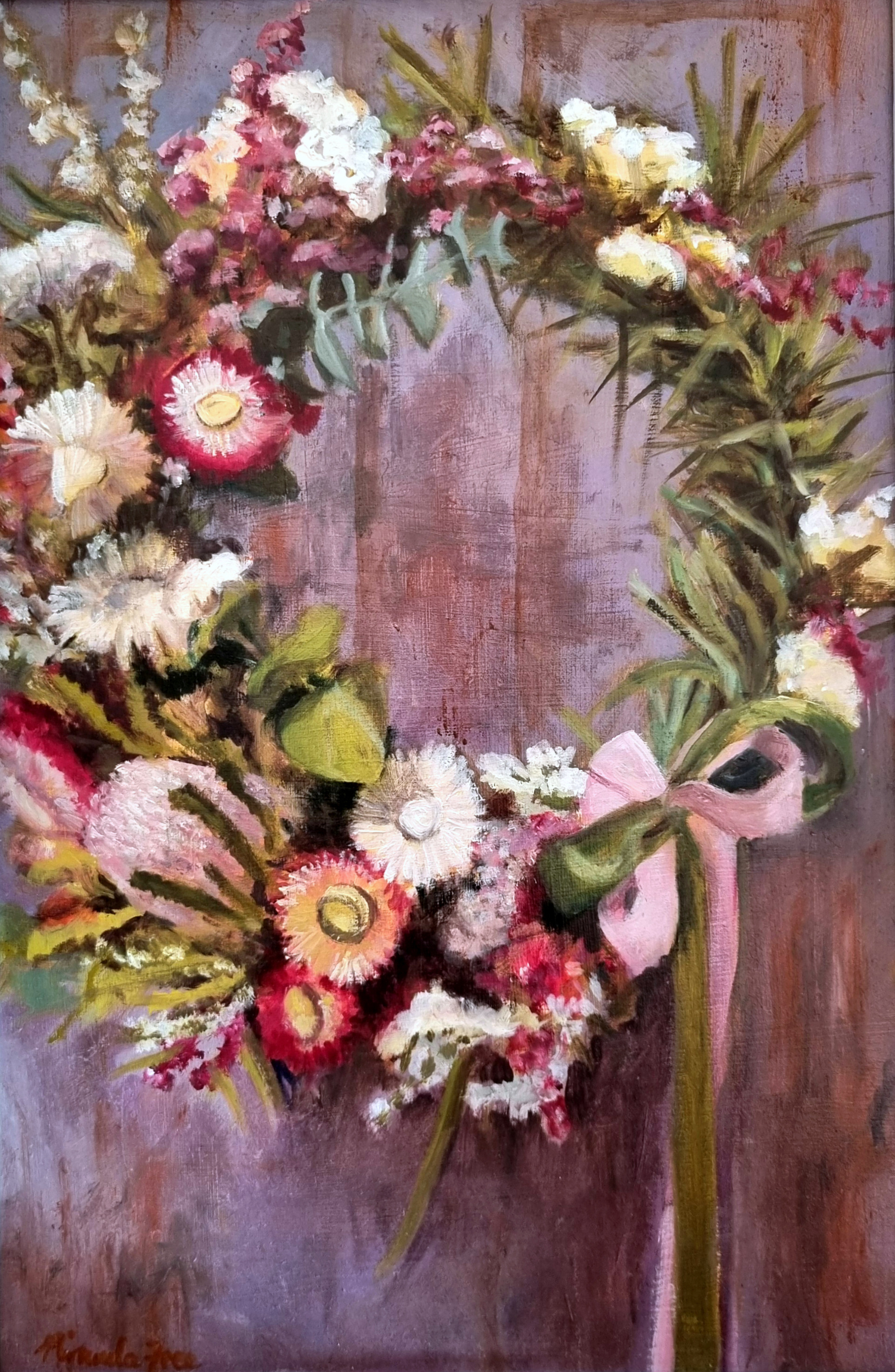 One of my friends is a sustainable florist who frequently creates wreaths with dried flowers and native foliage. This simple wreath of native flora that is finished with pretty ribbons hangs on an abstract mauve background. A white timber frame completes the work.