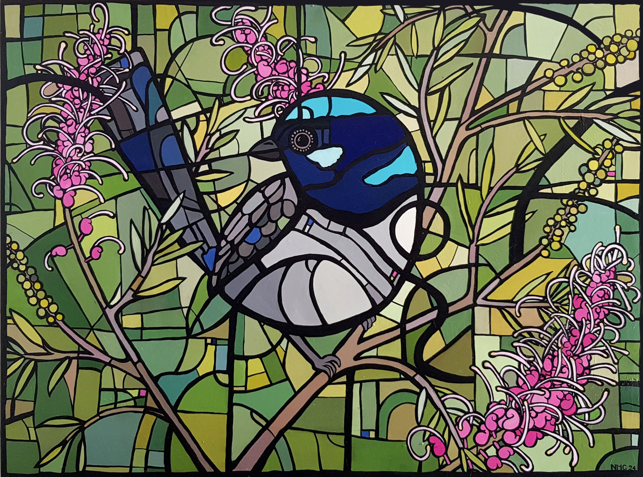The superb fairy wren is depicted oversized and abstracted with a framework of overlaying black lines to create geometric shapes. The bird is flanked between grevillea-filled branches of which the pink contrasts with the main palette of blues and greens.