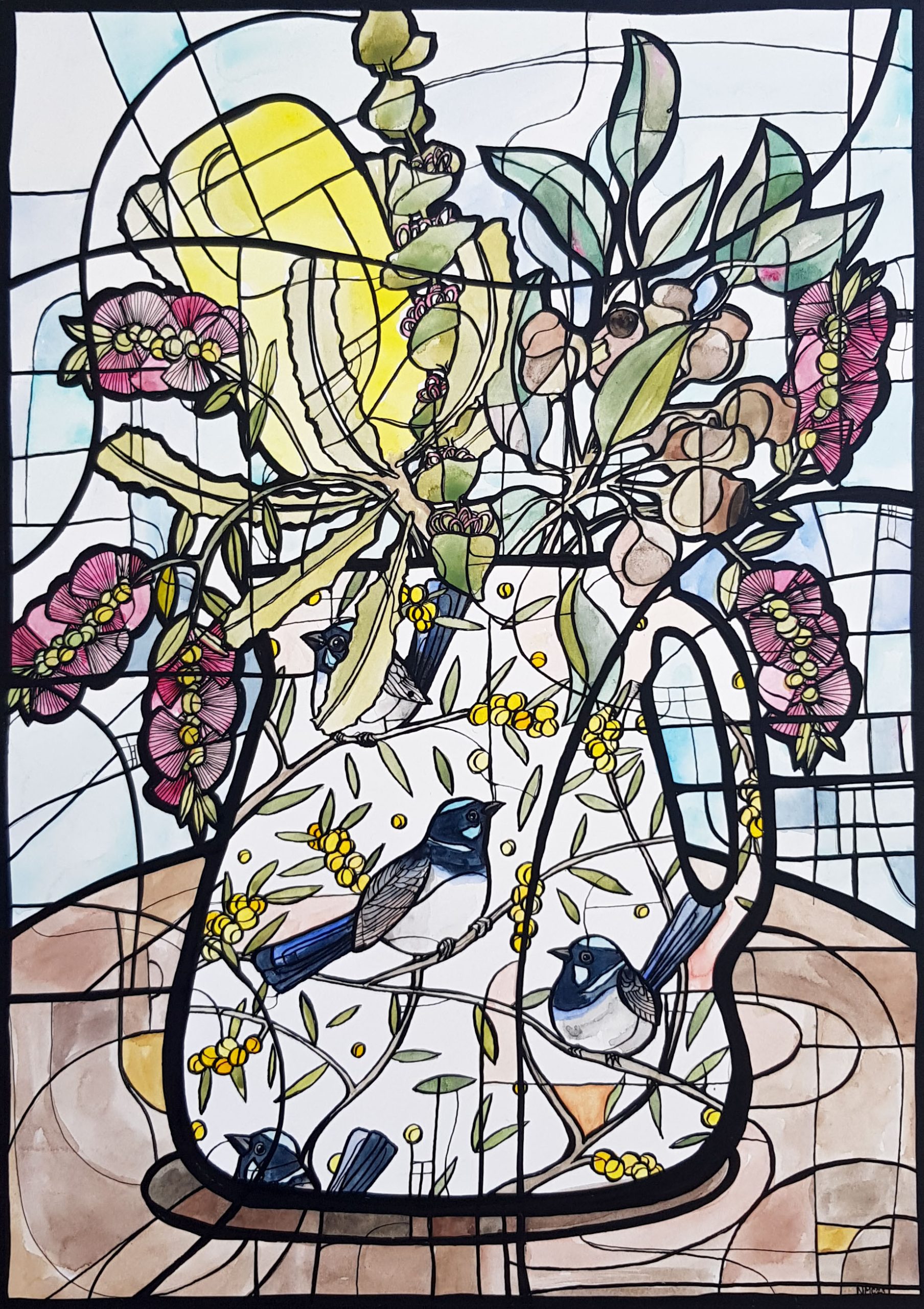 Washes of loose watercolours are held together by a framework of delicate ink linework which gives a stained glass effect.