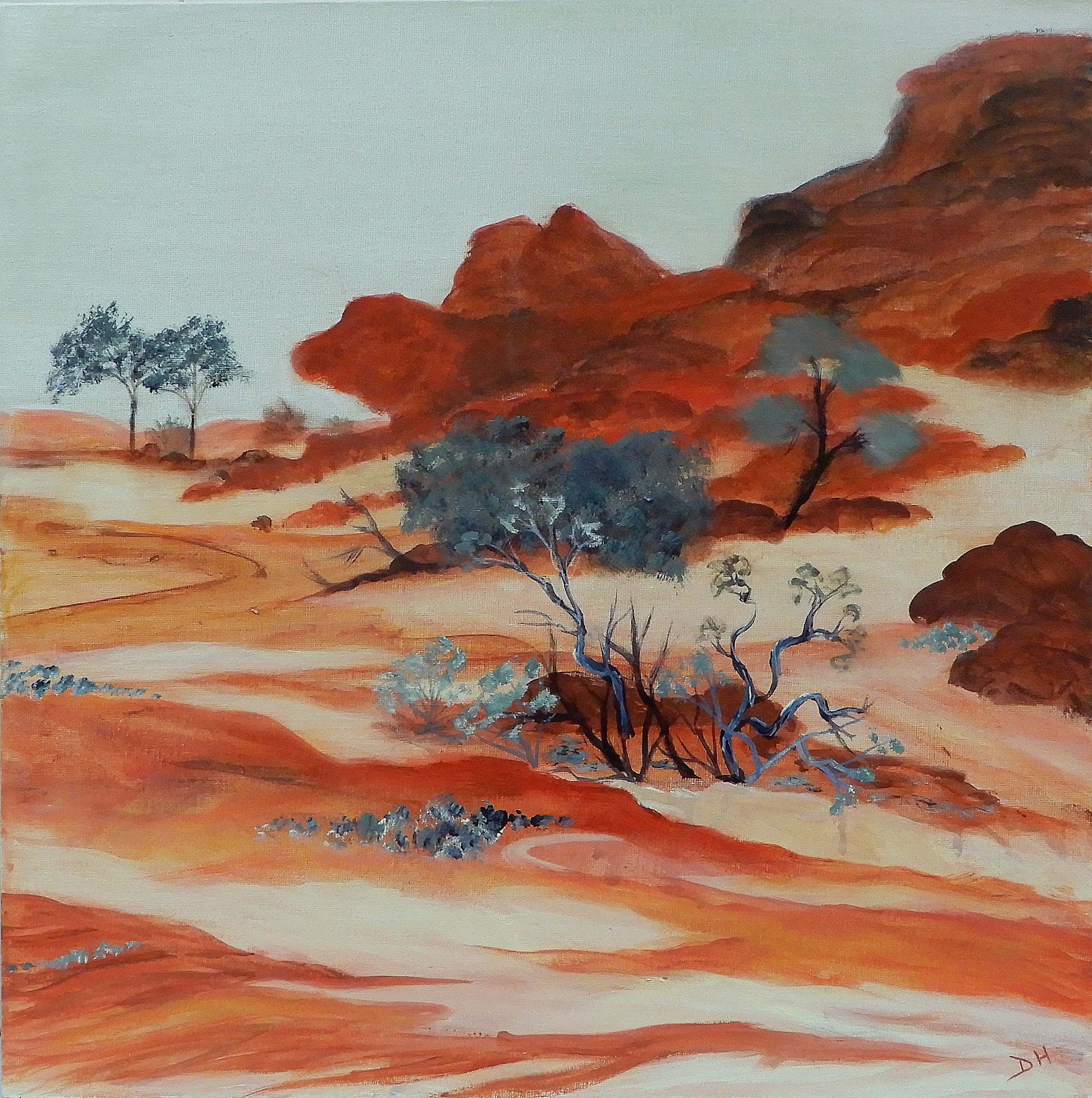 The colours of the clay pan around the extraordinary bluff and rocks that make up Wurre (Rainbow Valley) just outside Alice Springs are intense in the light of late afternoon. A walking track takes you to the base of the bluff where there are small outcrops of scrub with lovely light and shadow across the sand.