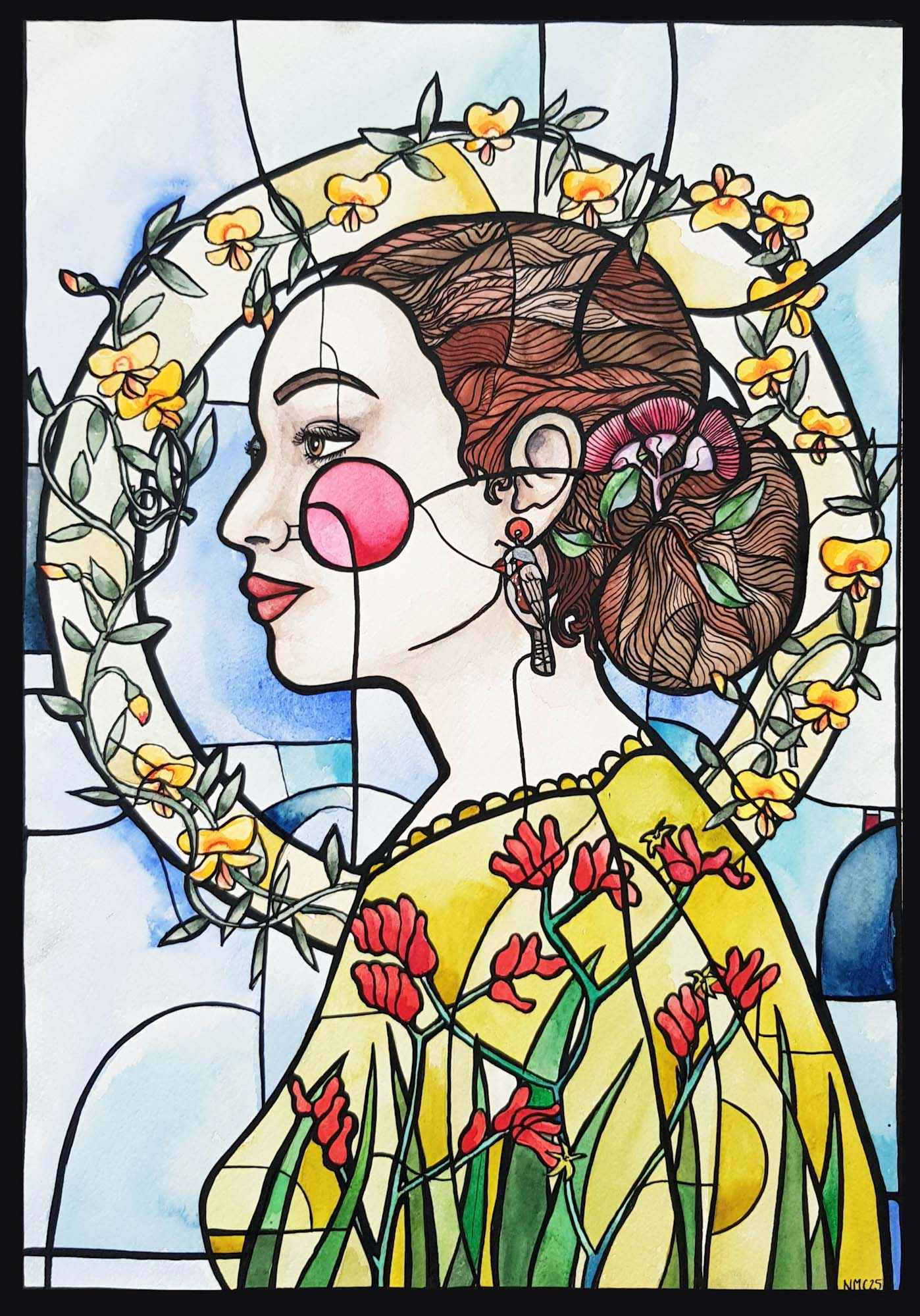 Xanthe, Greek for yellow, is a watercolour and ink painting inspired by the Art Nouveau style.