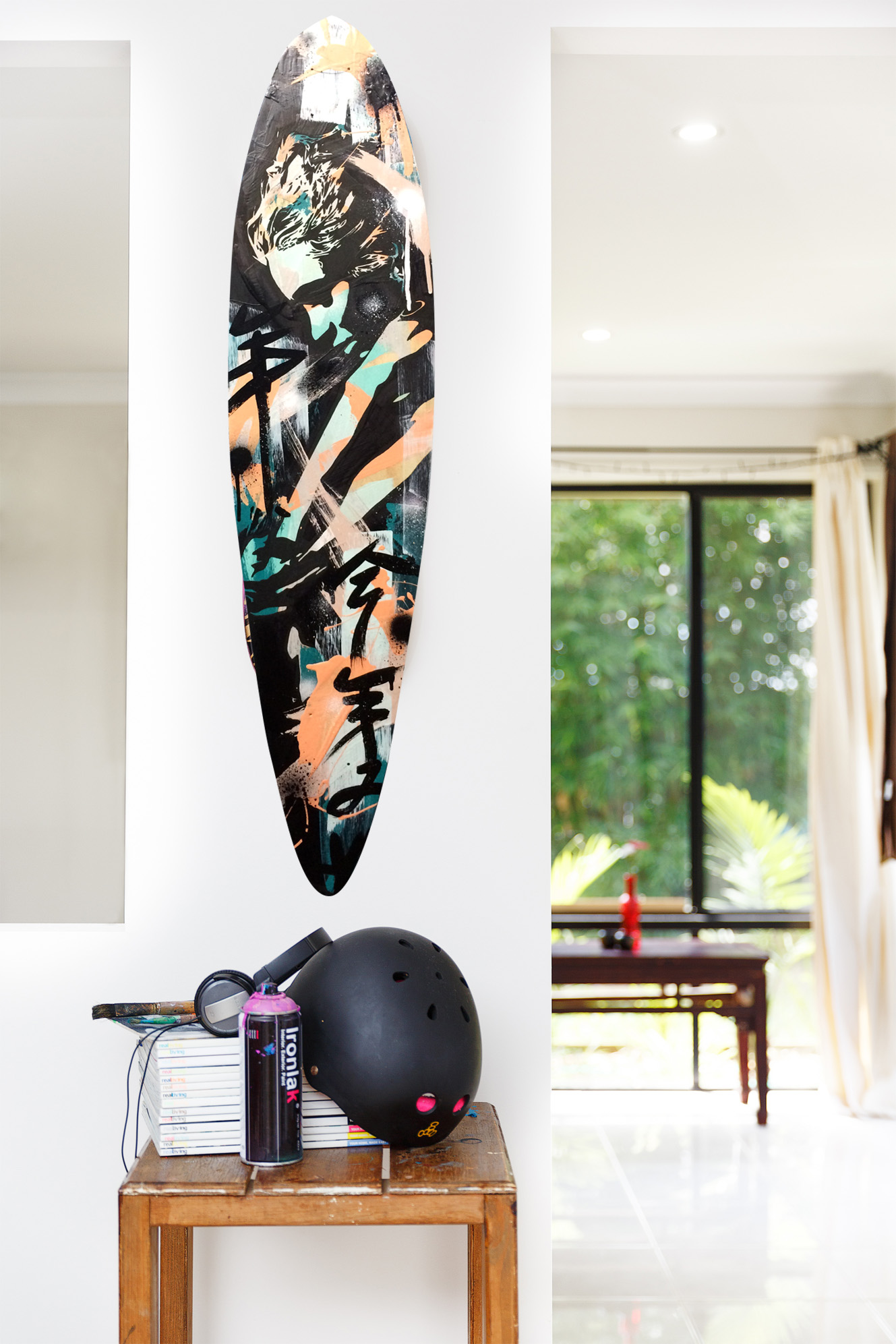 Acrylic, spray paint and nikko on skateboard 7mm non-structural high-quality plywood