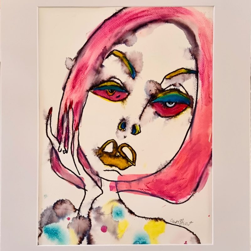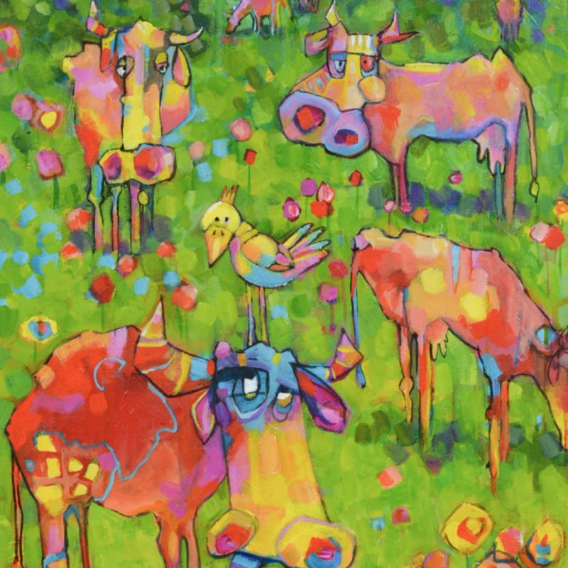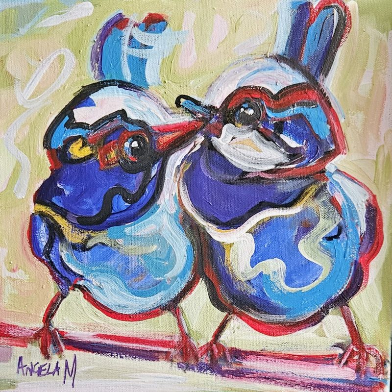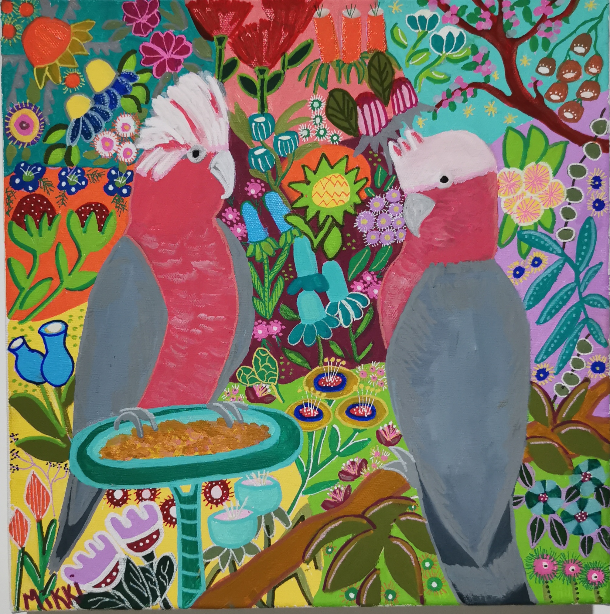 Ya Bloody Galah by Mikki Campbell – This artwork was inspired by the many cockatoos and galahs that used to regularly visit the large pine tree outside my family home. Whilst my Mother was frustrated no end by their mess after striping the branches when feeding, I on the other hand found them cheeky, funny, and full spirited! Mixed media – acrylic paint and posca pens.